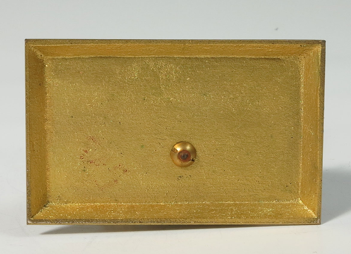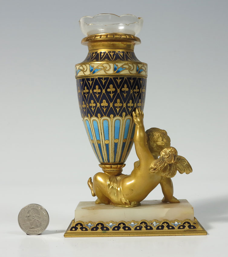 FRENCH ENAMEL GILT BRONZE CHERUB BUD VASE: Gilt bronze cherub holding an enamel bud vase with replacement glass insert. On enamel bronze base with marble insert. Measures 6 5/8'' x 4 1/4'' x 2 5/8''.