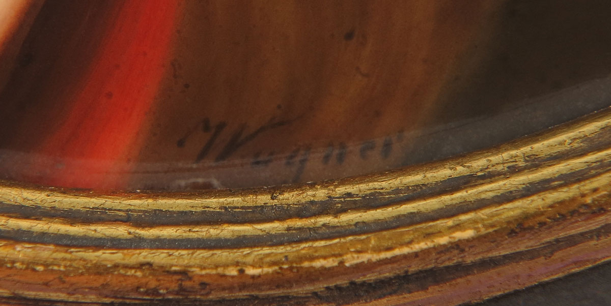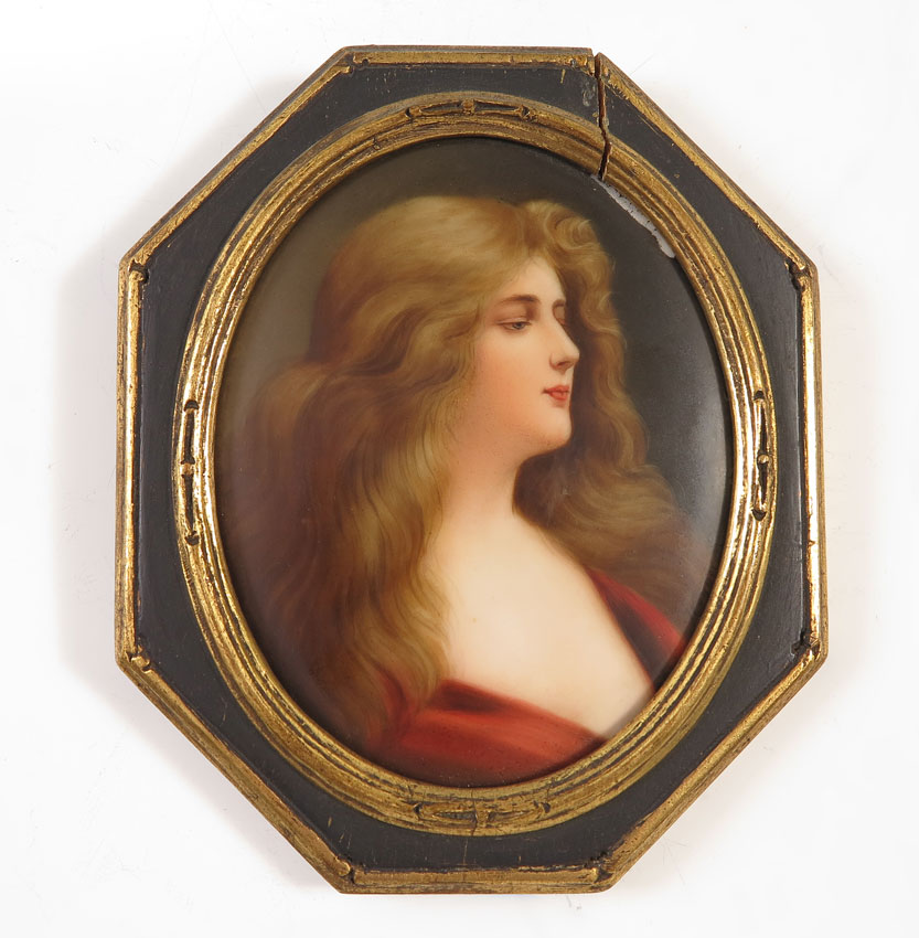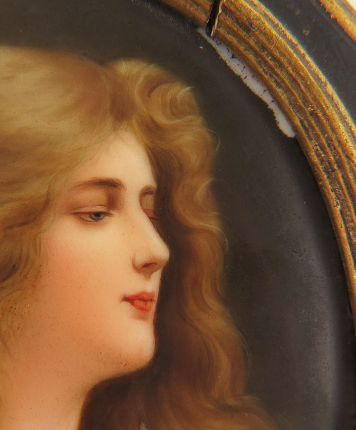 HUTSCHENREUTHER PAINTING AFTER ASTI, ''REFLECTION'': Oval, 5 5/18'' x 4'', signed lower right, Wagner, impressed mark verso, encased in original gilded and painted frame with repair.
