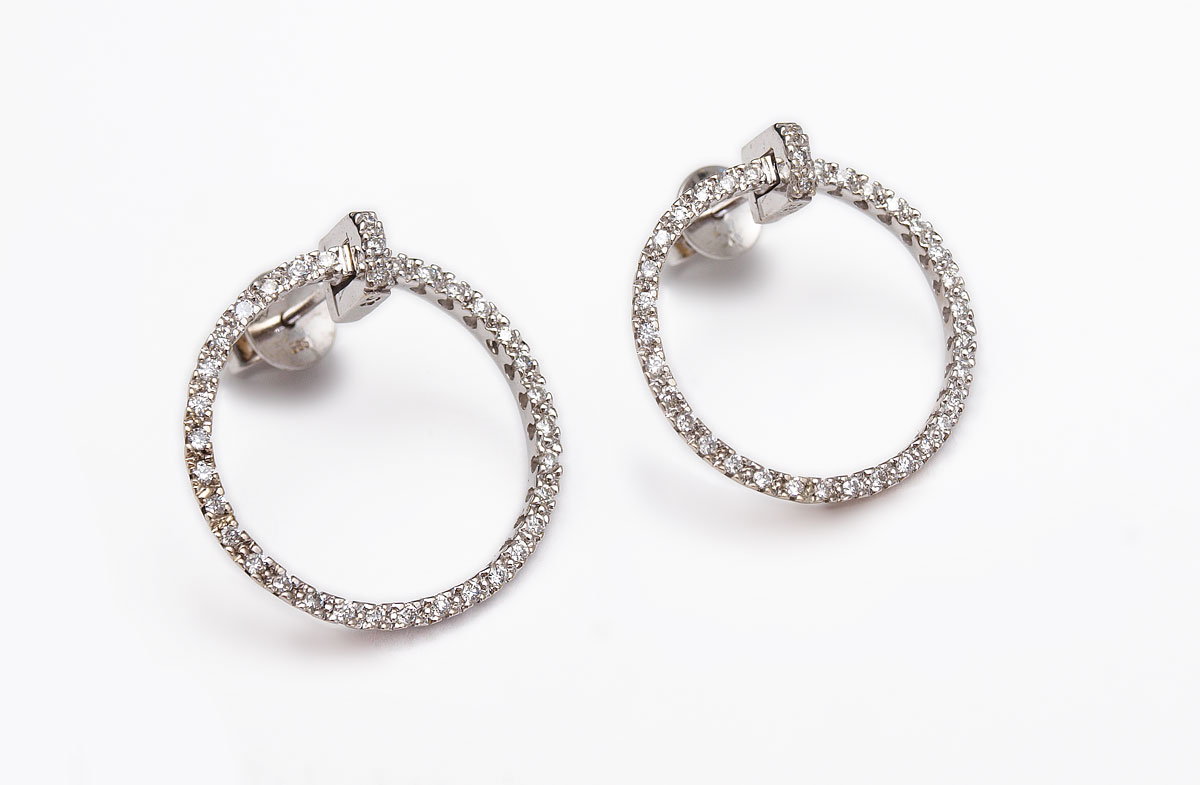 14K DIAMOND CIRCLE EARRINGS: 14K white gold circles contain 70 round brilliant cut diamonds. totaling approx. .50 Ct. The diamonds average SI in clarity and H-I in color. The diamonds are prong set. Post and nut closures. Dia: 7/8''. Weight: 4.7 grams.