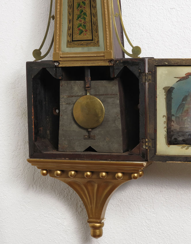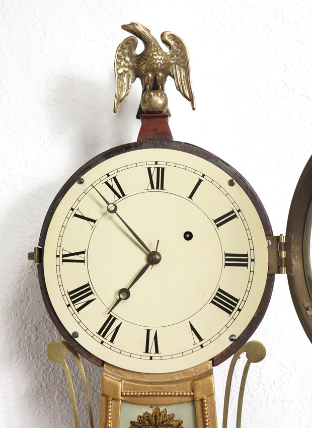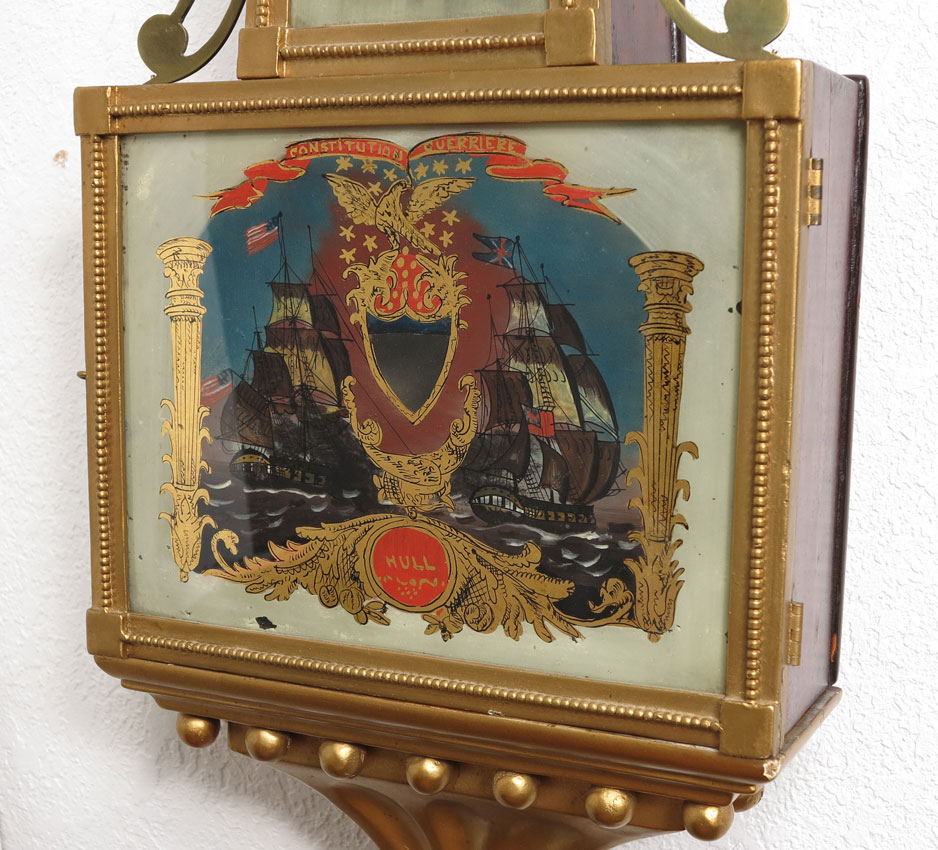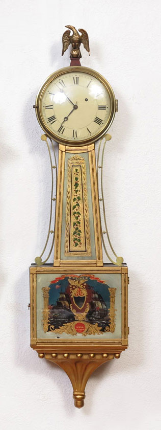 REVERSE PAINTED USS CONSTITUTION BANJO CLOCK: Cast eagle finial, mahogany case with gilt front. Painted metal dial with Roman numerals under curved glass crystal, floral reverse painted center glass, lower glass painted with War of 1812 theme USS Constitution and HMS Guerriere battle scene and commanders name ''Hull'' in shield. Unmarked time only movement. Key and pendulum in office. Overall 40 1/2'' h. x 10 1/4'' x 3 3/4''.