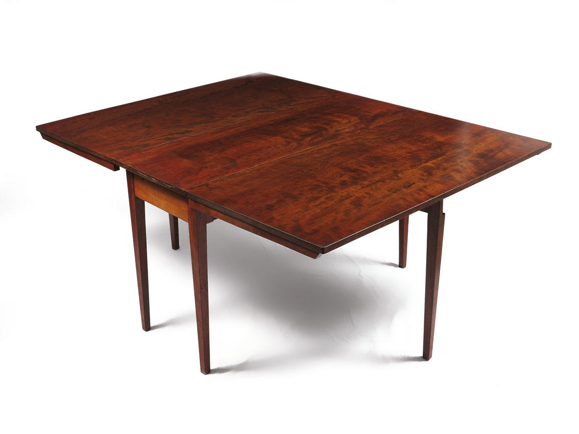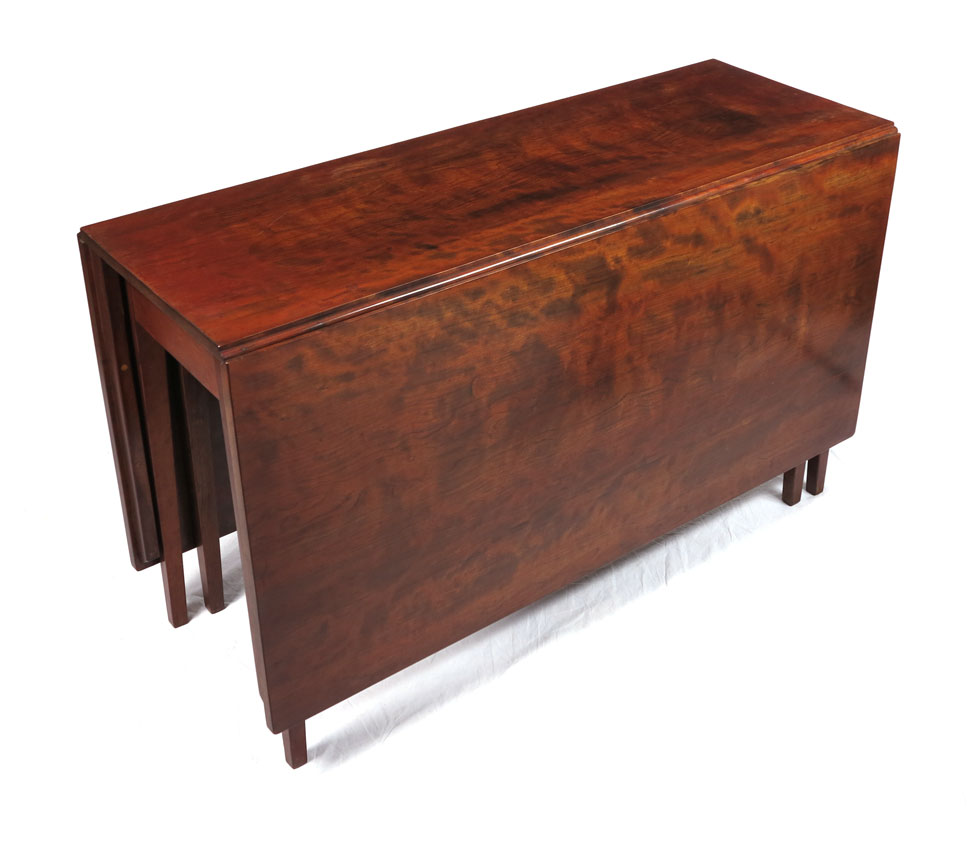 BEAUTIFULLY GRAINED DROP LEAF TABLE: Black walnut or possibly rosewood wide leaf table. Measures approx. 28'' high x 48'' long x 17'' wide. Each leaf is 23''. Swing legs.