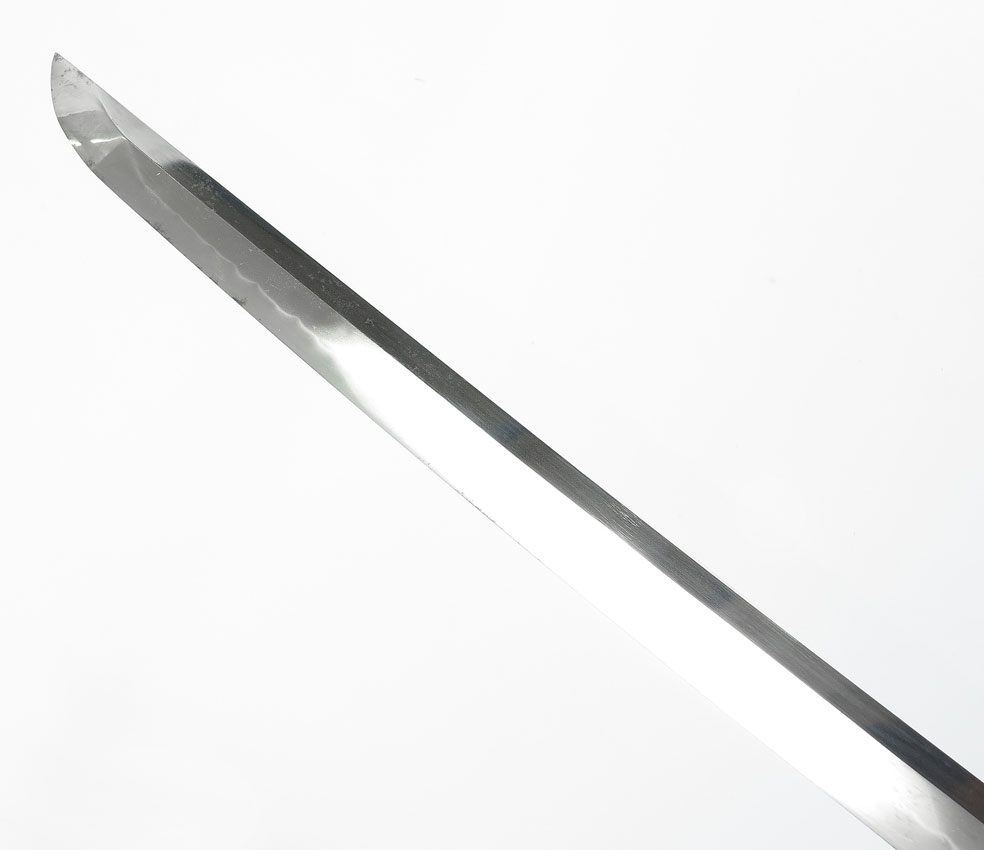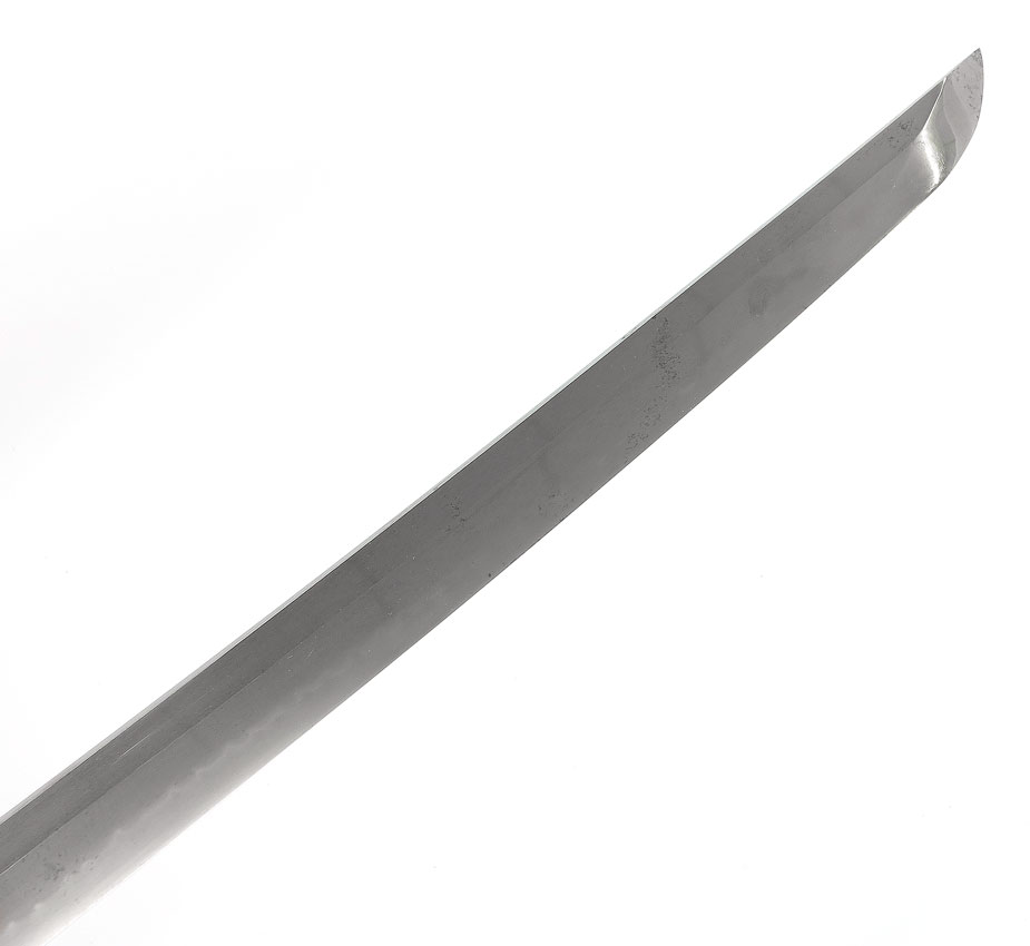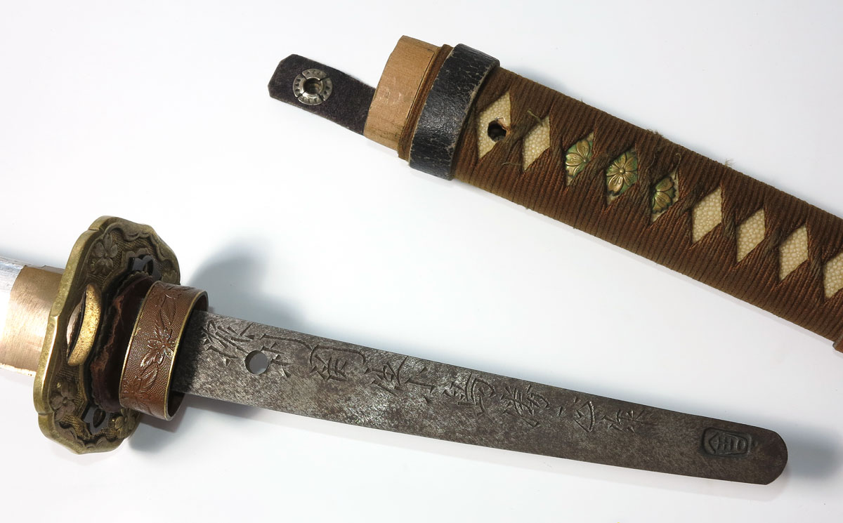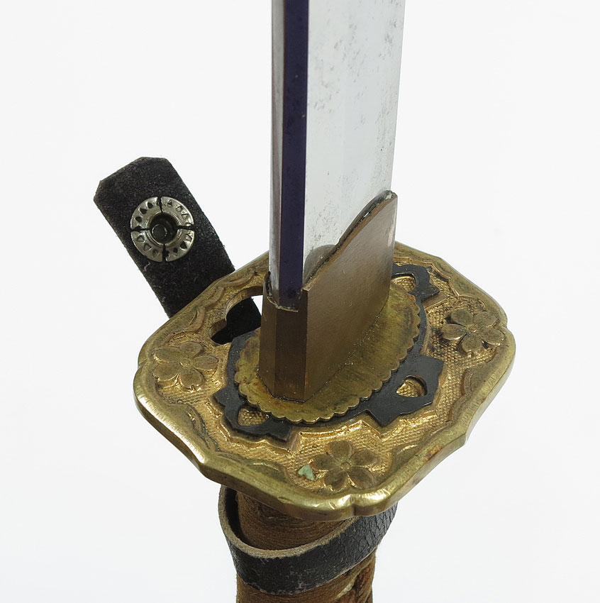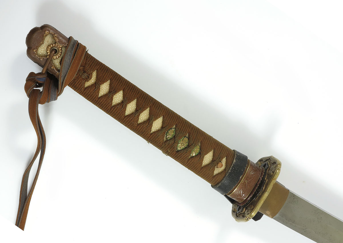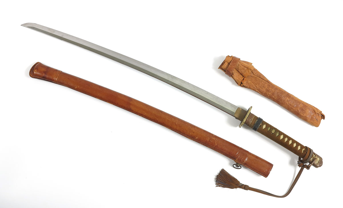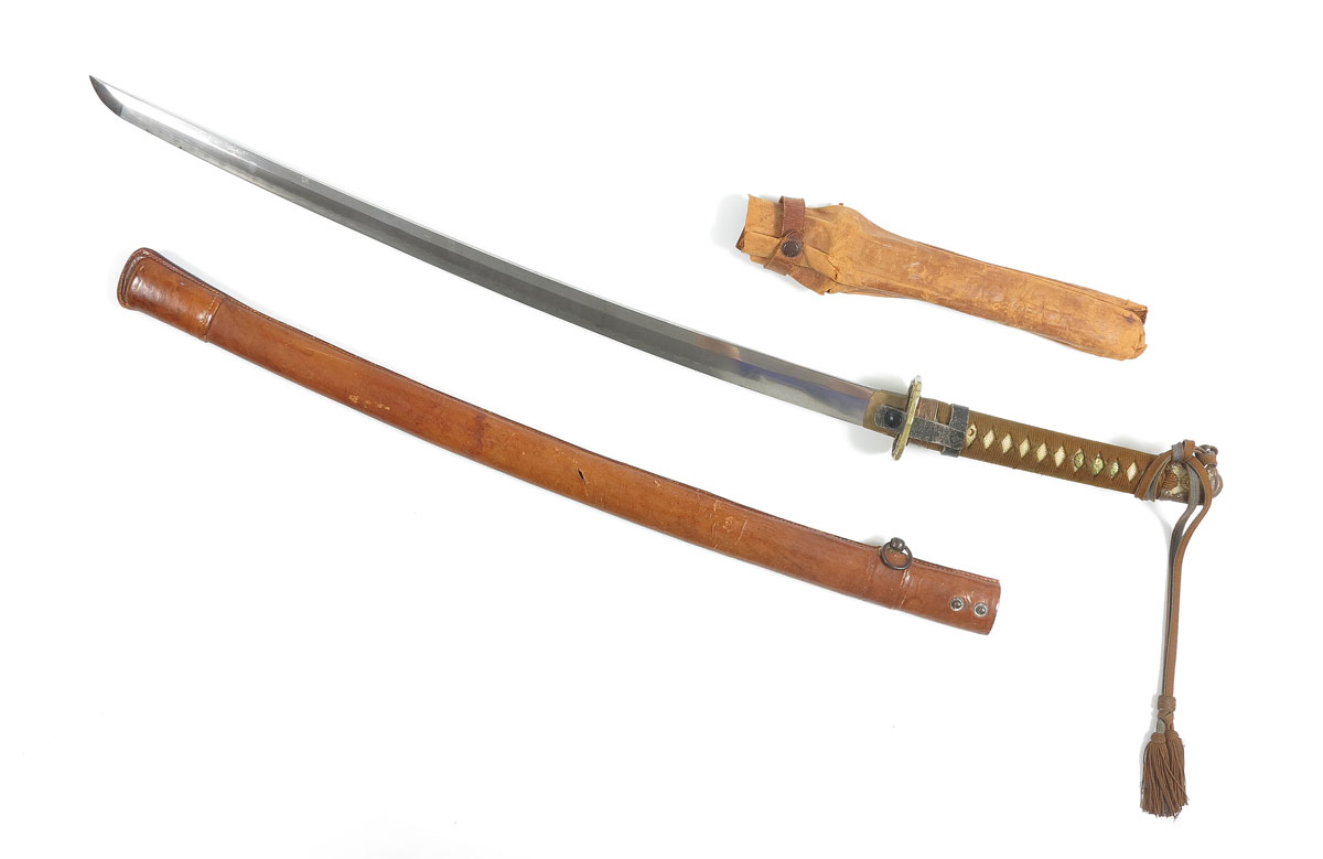 WWII JAPANESE SEKI SCHOOL KATANA SWORD: Blade by Kojima Katsumasa of the Seki (National Technical) School, 27 5/8'' blade. Complete with leather sheath over scabbard and leather cover for tsuka. Floral motif menuki, tsuba and kashira, rayskin same and cloth ito. Sold with tassel. Overall 38 7/8'' long.