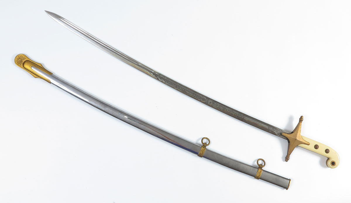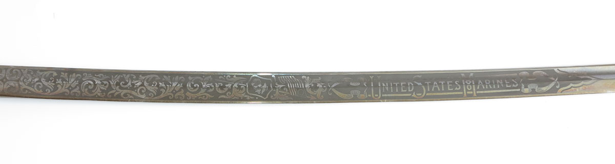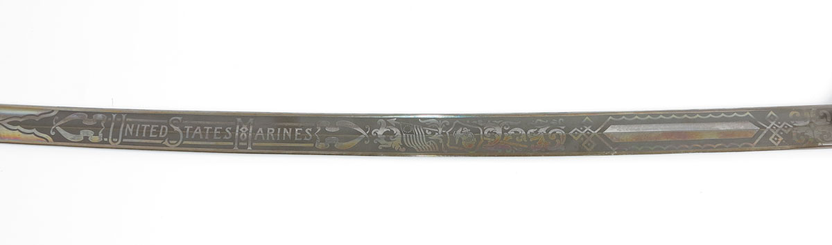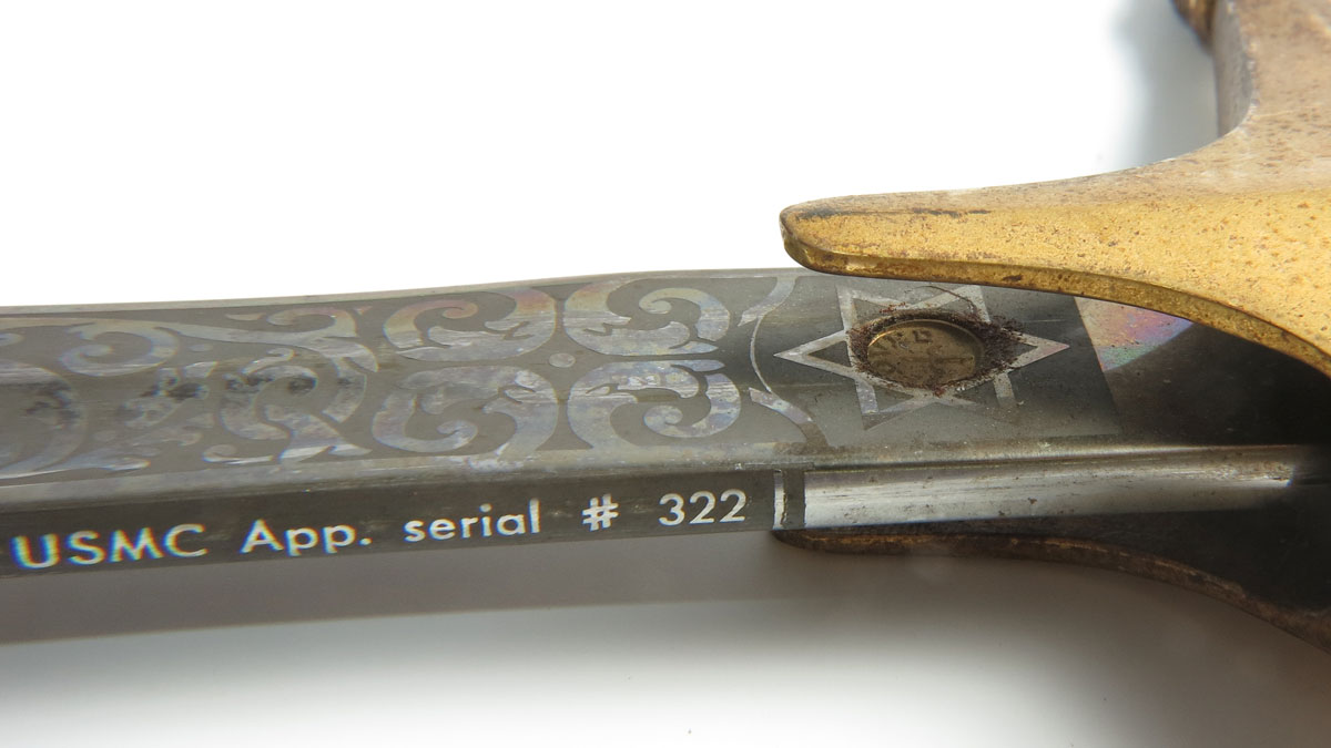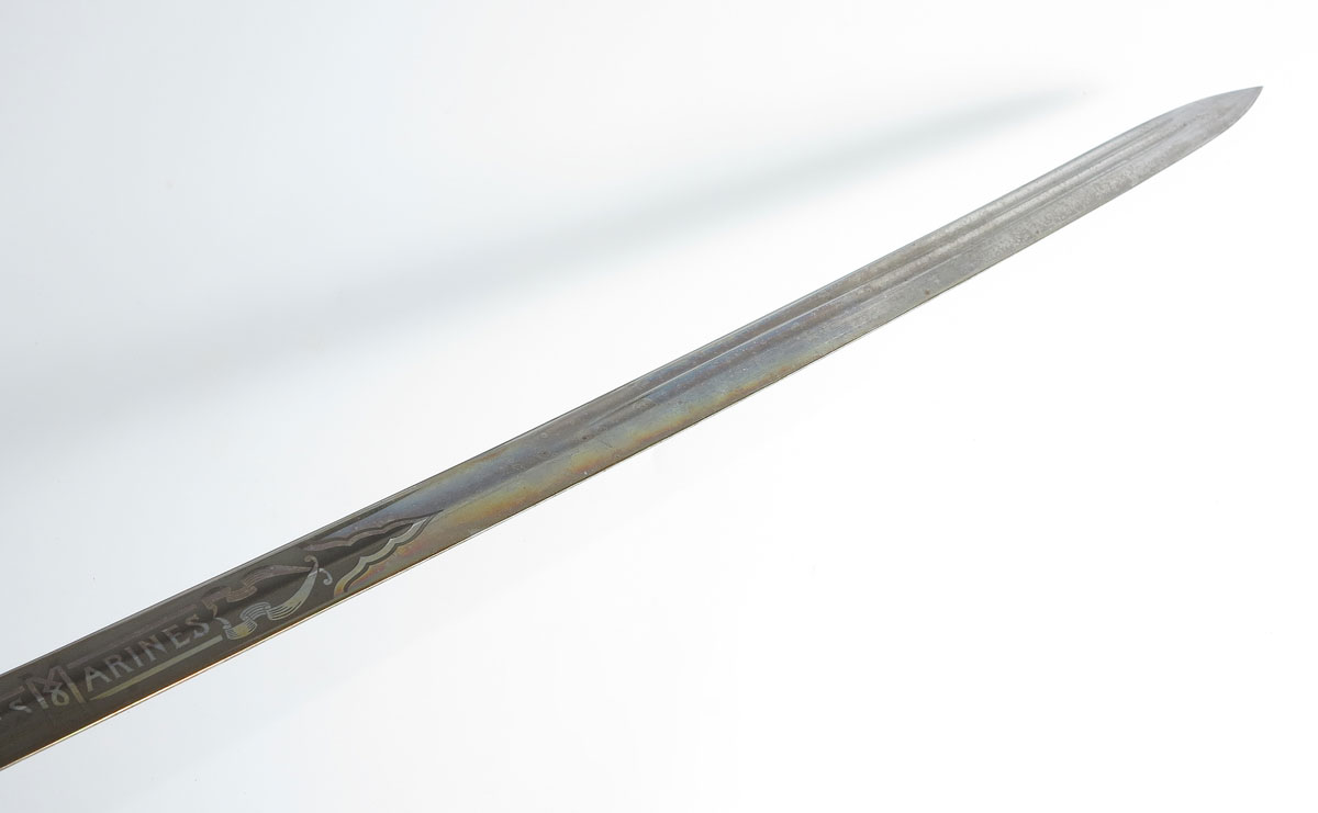 KOREAN WAR ERA US MARINES OFFICERS MAMELUKE SWORD: Faux ivory grip, brass cross guard. N. S. Meyer retailed West German 29 1/2'' blade, heavily etched, US App. serial # 322 on spine of blade indicating Korean War era. Polished steel scabbard with gilt brass mounts. Overall 37'' long overall.