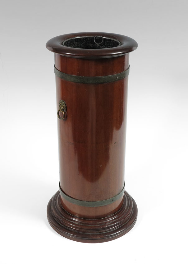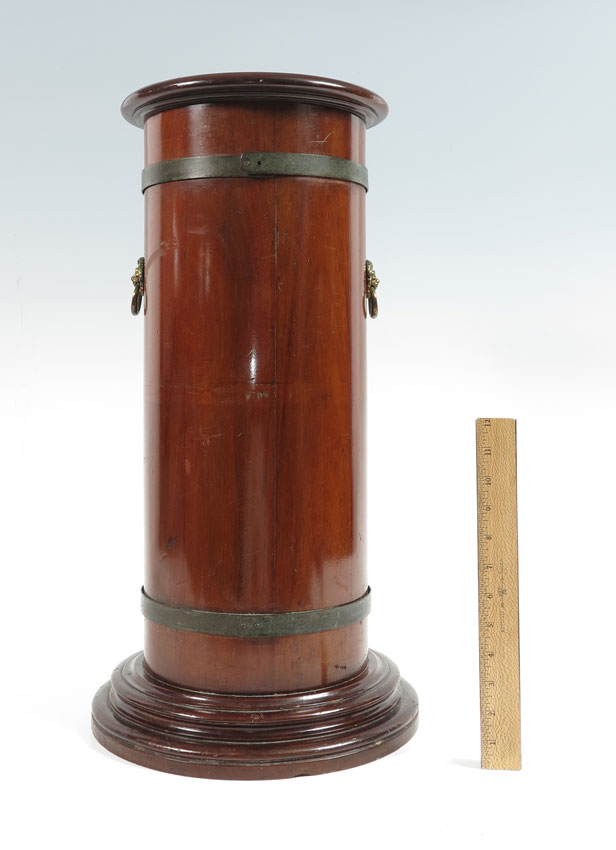 WALNUT UMBRELLA STAND WITH METAL INSERT: Turned walnut exterior with applied masqueron handles. Measures 24 1/2'' h. x 13'' base dia. Insert dia. 6 7/8''.