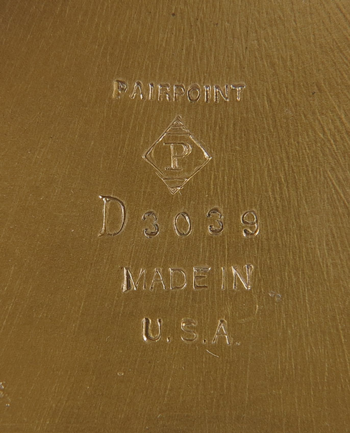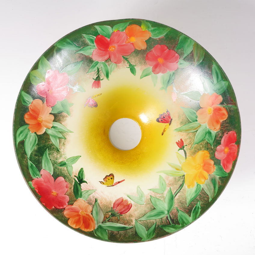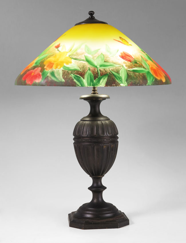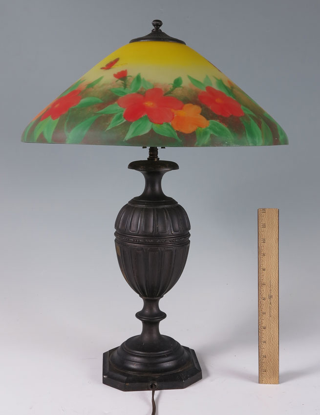 PAIRPOINT LAMP BASE D3039 WITH REVERSE PAINTED GLASS SHADE: Base is signed, the shade with vibrant floral and butterfly may be later. Lamp measures 25'' tall, the domed shade 18'' dia.