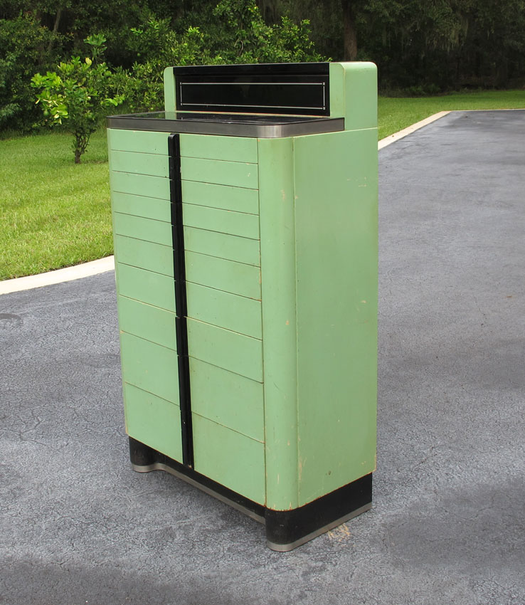 GREEN PAINTED DENTAL CABINET: Green and black painted exterior with chrome trim. 10 graduated drawers. Measures 50'' h. x 30'' x 16''.