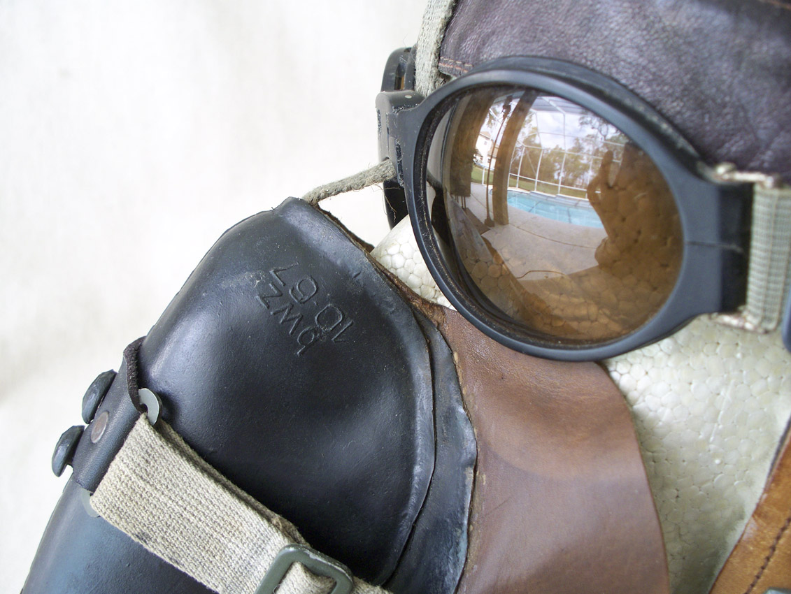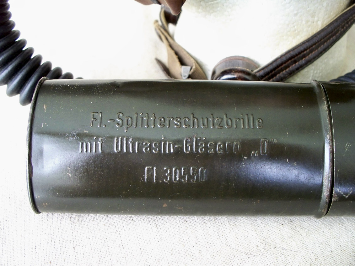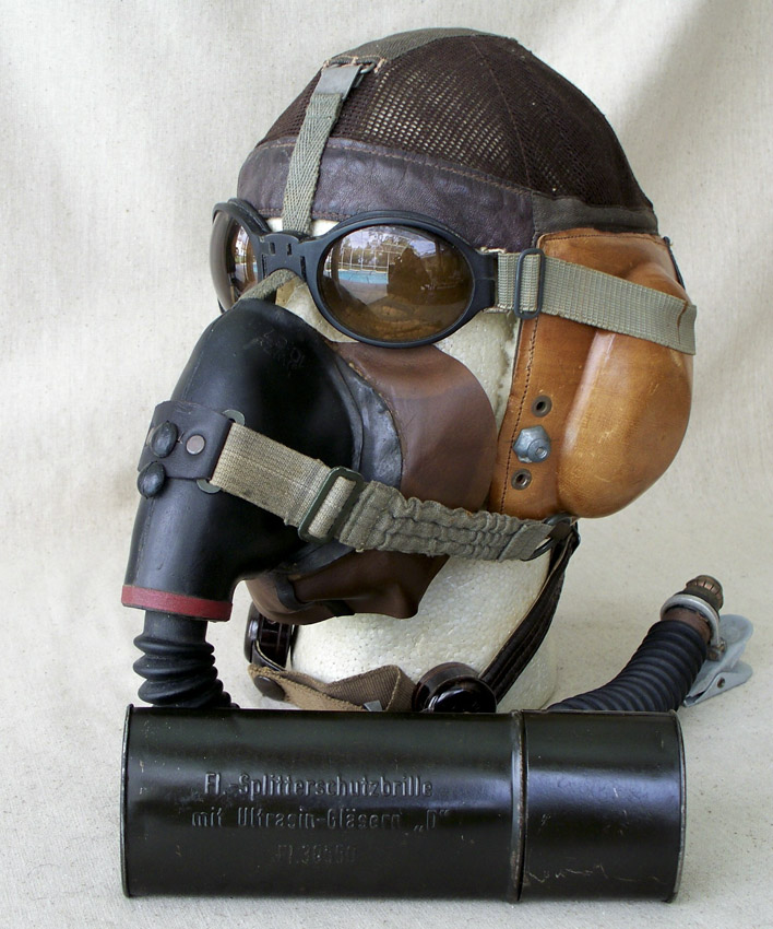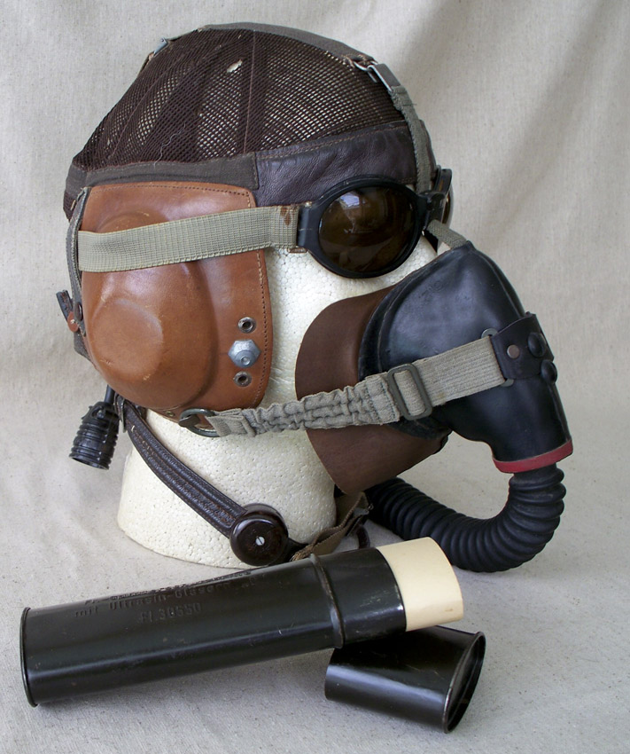 GERMAN LPKN-101 SUMMER FLIGHT HELMET: Label on inside of helmet Netzkopfhaube GR50 or KD, LKP-N-101, NA9 Herstetellar, Code-BXO, which is a summer weight with a mesh top to keep the top of head cool. Also includes 3 strap model 10-67 oxygen mask, splinter proof goggles with metal embossed case and cardboard interior liner. Splitterschulzbrille. Throat mics marked Mi4b, BXO 69 Ln26779-3 the above is on both throat mics. Material running down the center of the outside top of helmet to accommodate the 3 point oxygen mask; which is top fastened. Has short communication cord, 43-4/KO-43/363-1 light brown earphone inside housing of oxygen mask. Goggle case, metal case with cardboard original interior liner. Description on front stamped into the metal in German, 99% of paint remains on case including top and bottom. Sold on styrofoam head mount, overall 11 3/4'' h. x 11 1/2'' x 8 1/4''.
