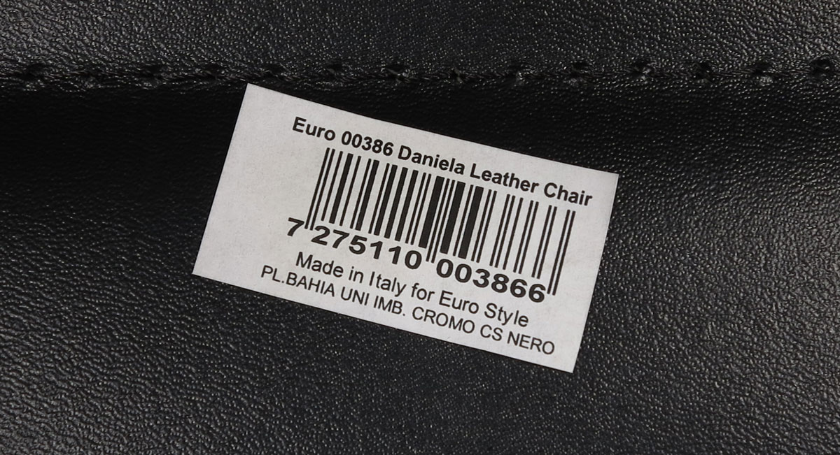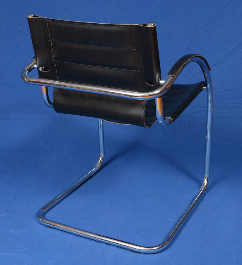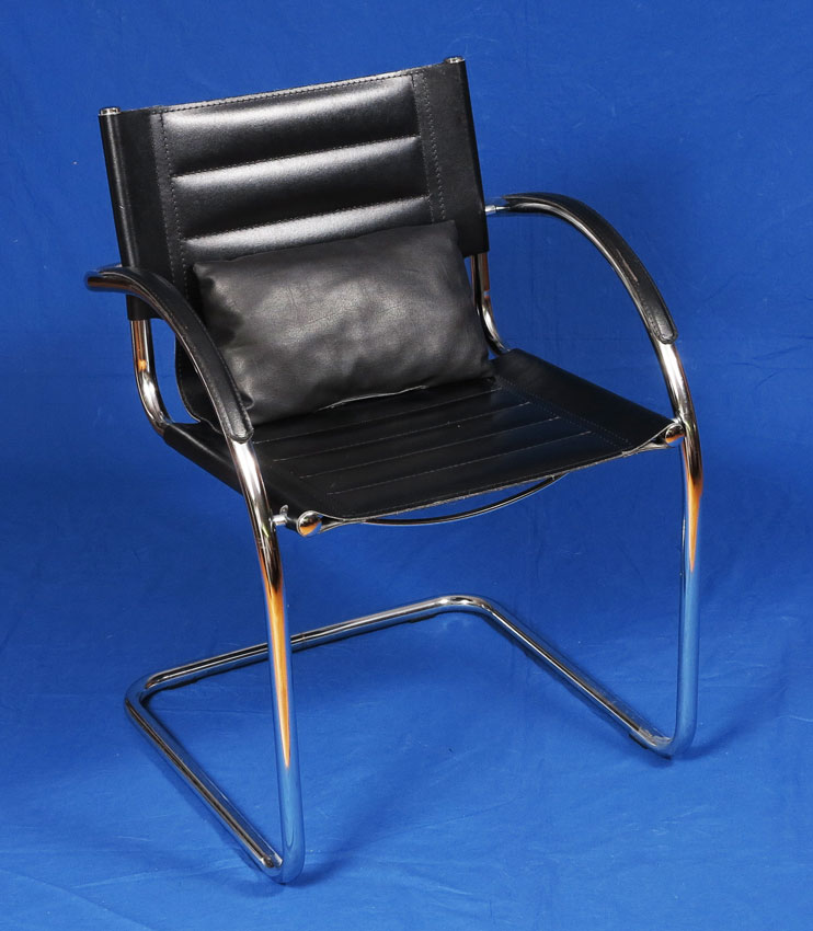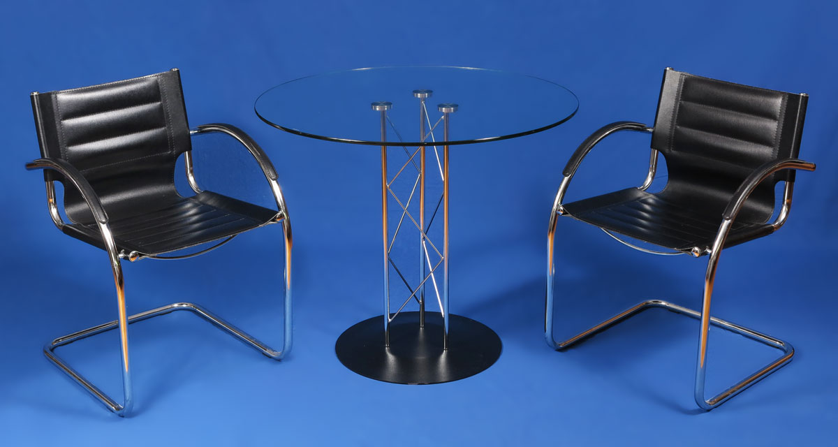 PAIR DANIELA ITALIAN MODERN CHAIRS AND GLASS TOP TABLE: Cafe set, steel and black leather arm chairs, 31'h. x 24'' x 22''. Paper label. Made in Italy for Euro Style Sold together with an Italian modern glass top and steel table, 35 1/2'' dia. .