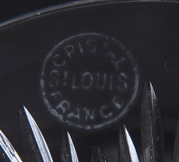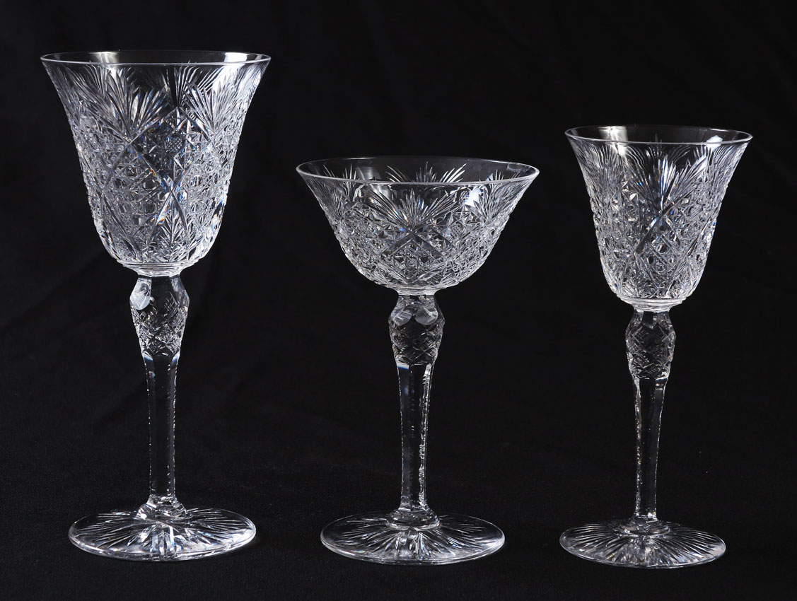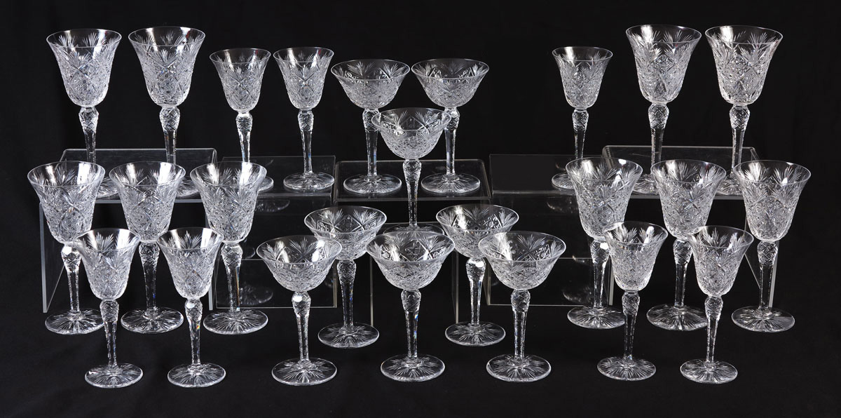 SIGNED ST. LOUIS FRENCH CUT CRYSTAL: 25 pieces to include 10 goblets (7 7/8''), 7 wine (6 3/4''), and 8 sherbert / champagne (6'').