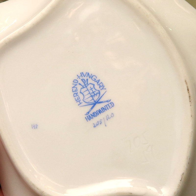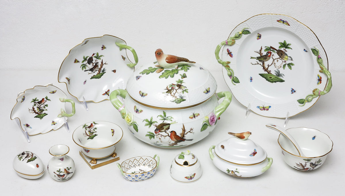 11 PIECE HEREND PORCELAIN ''ROTHSCHILD'': To include the bird finial covered serving bowl (8''h. x 10'' dia.), mini flared rim bowl on paw foot pedestal (2 1/4''h. x 4 1/2''), covered egg (3''l), a 2 3/4'' vase, mini reticulated basket (3 1/2''l), a sauce bowl and ladle (4 3/4'' dia.), an 11'' branch handle cake plate, two leaf shape nappy dishes (5 3/4'' and 8''), covered mustard (2 1/2'' dia.), and a bird finial covered sauce (5 1/4'' l.)