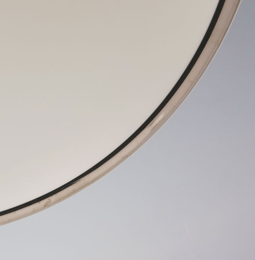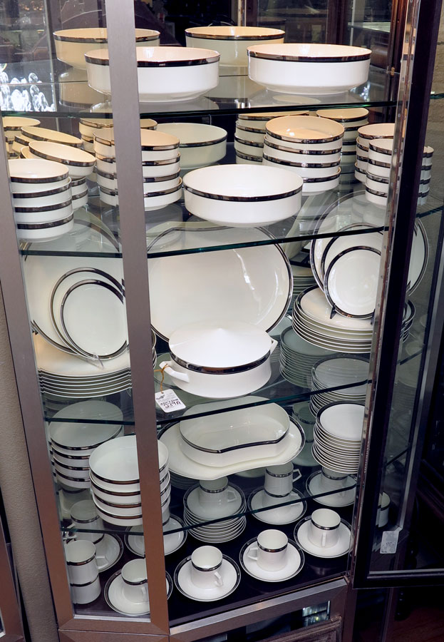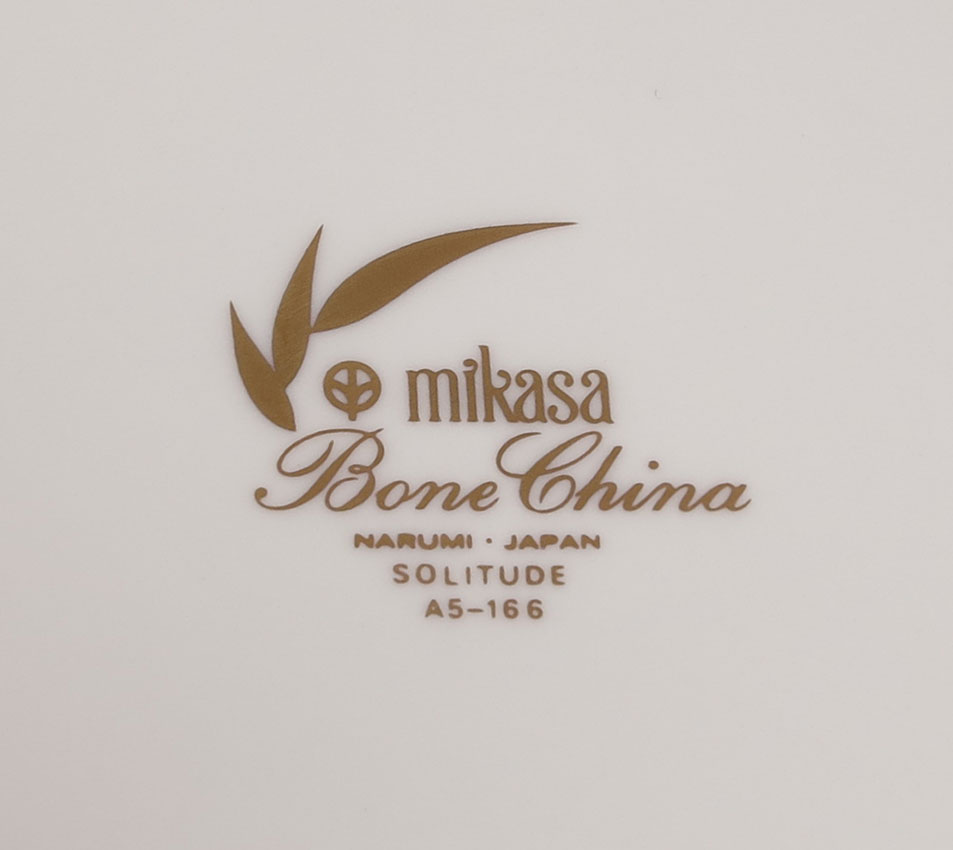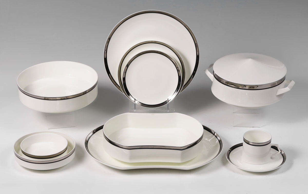 MIKASA ''SOLITUDE'' FINE CHINA SERVICE FOR 16: Black and platinum border. 16 each of dinner plates (10 5/8''), salad plates, soup bowls, bread plates, dessert bowls, cups, and saucers. Serving pieces include 2 platters, oval vegetable bowl, 3 round vegetable bowls, and a covered casserole.