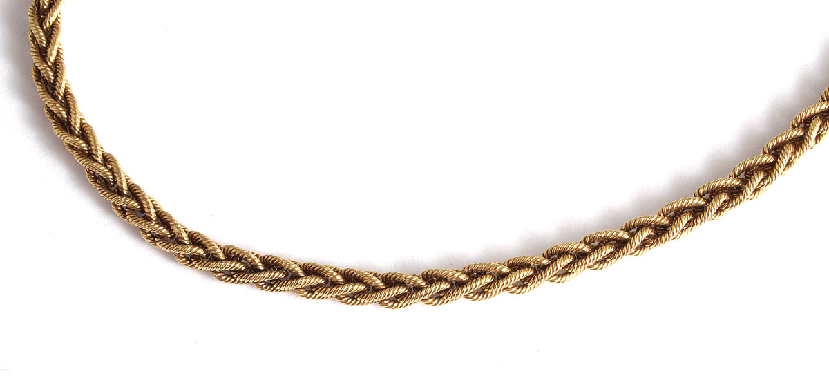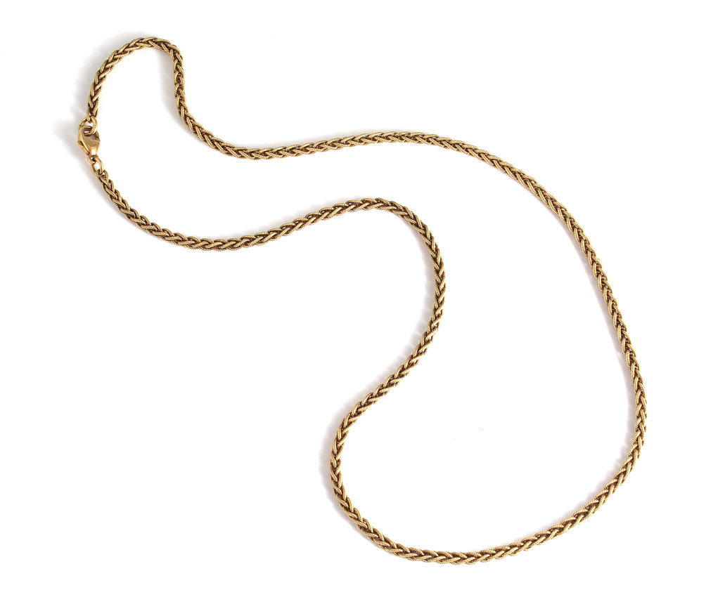 18K BRAIDED GOLD NECKLACE: 18K yellow gold necklace. Braided wire cable approx. 2.70 mm. Length: 20'' Decorative lobster claw clasp. Weight: 23.5 grams.