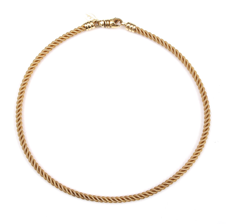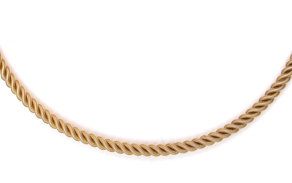 GOLD TWISTED CABLE NECKLACE: 14K yellow gold twisted cable necklace. Width approx. 4.50 mm. Length: 16'' Decorative lobster claw clasp. Tag is signed: Bolero/14K Aurafin Weight: 31.0 grams.