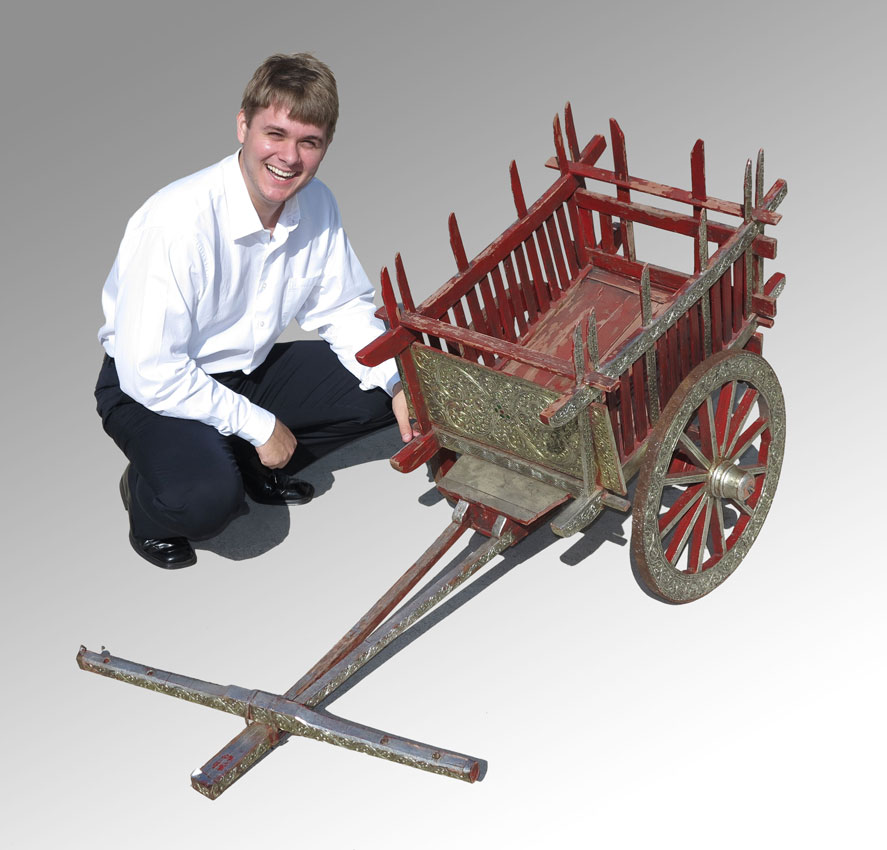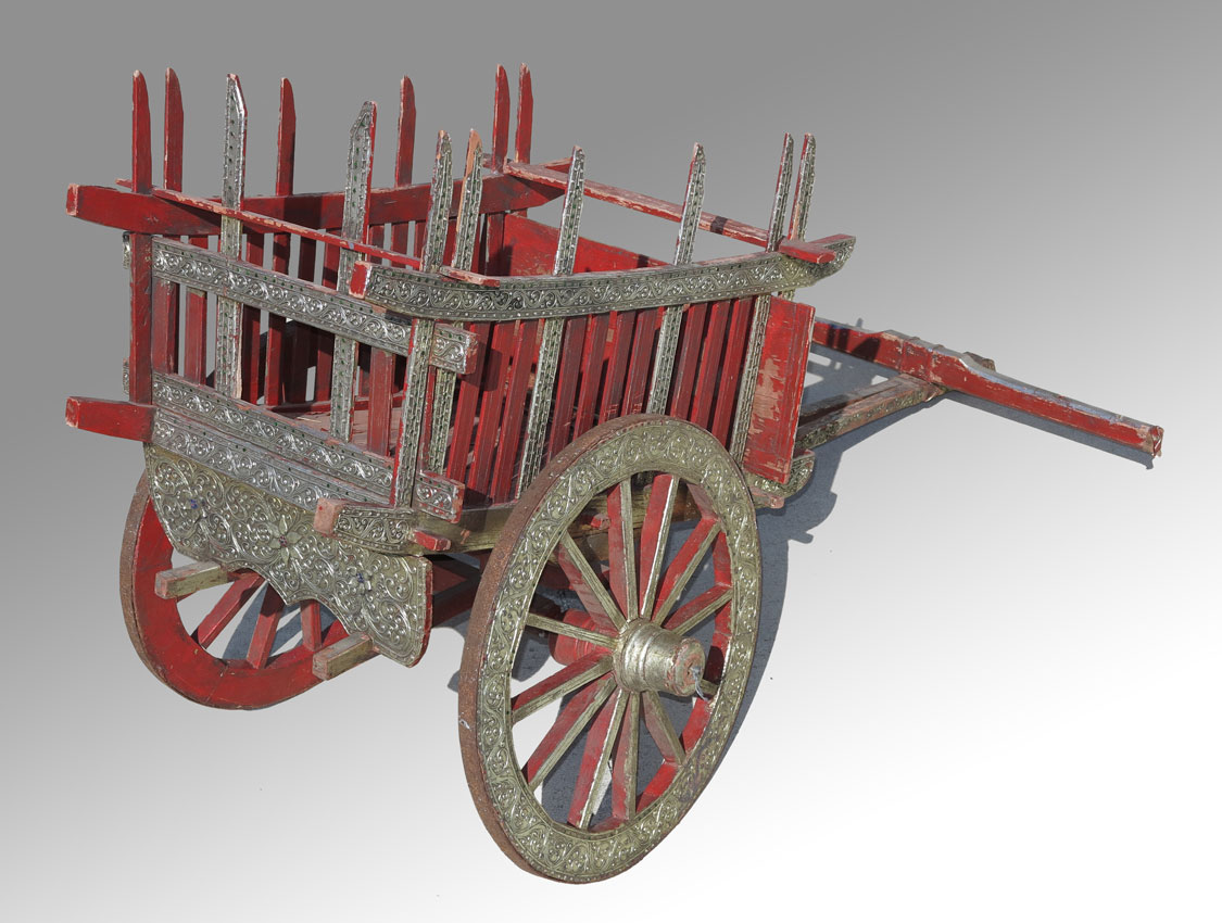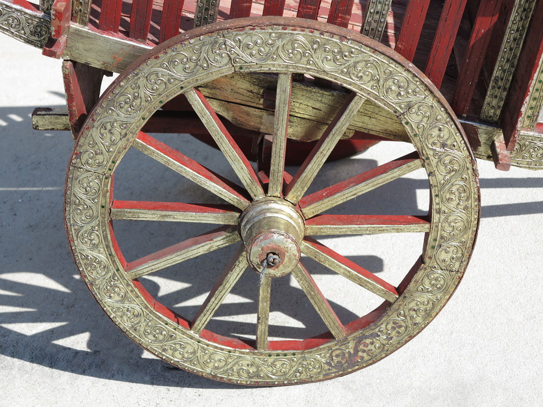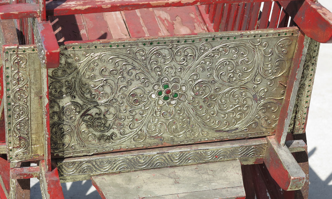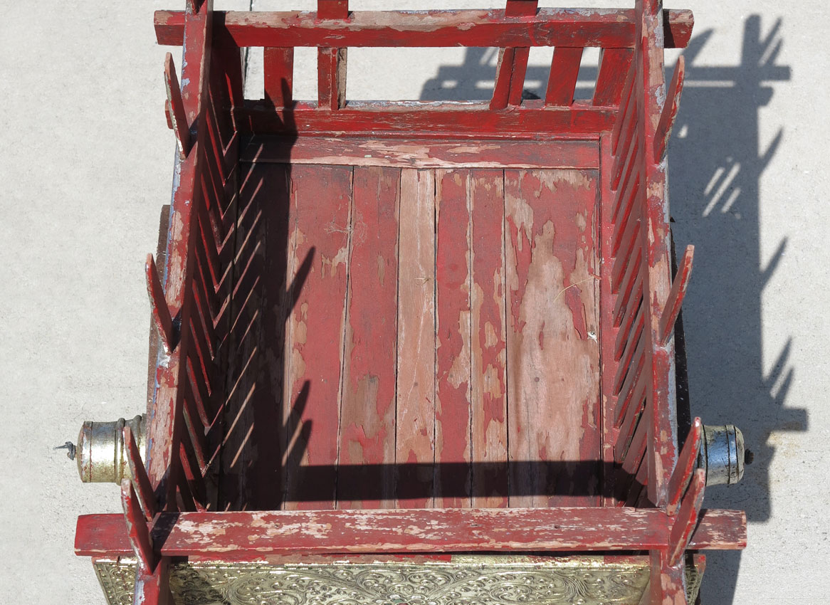 PAINT DECORATED CHINESE PARADE CART: Red and silver painted with applied green cabochon decoration. Age unknown, 34'' h. x 67 1/2'' x 30''.