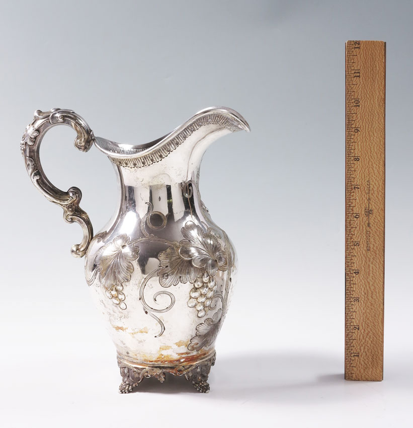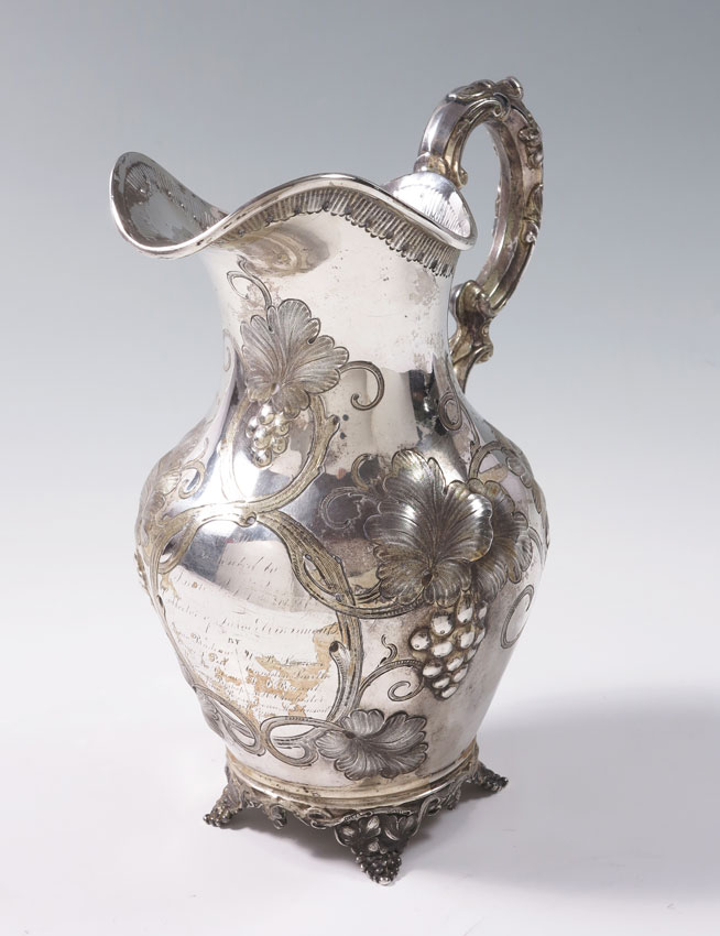 SQUIRE & BROTHER COIN SILVER PRESENTATION PITCHER: Repousse and engraved grape vine motifs, illegible presentation dated 1853. Marked Squire & Brother of Coin on base. 10'' h. x 8 1/4''. Approx. 22.7 troy oz.