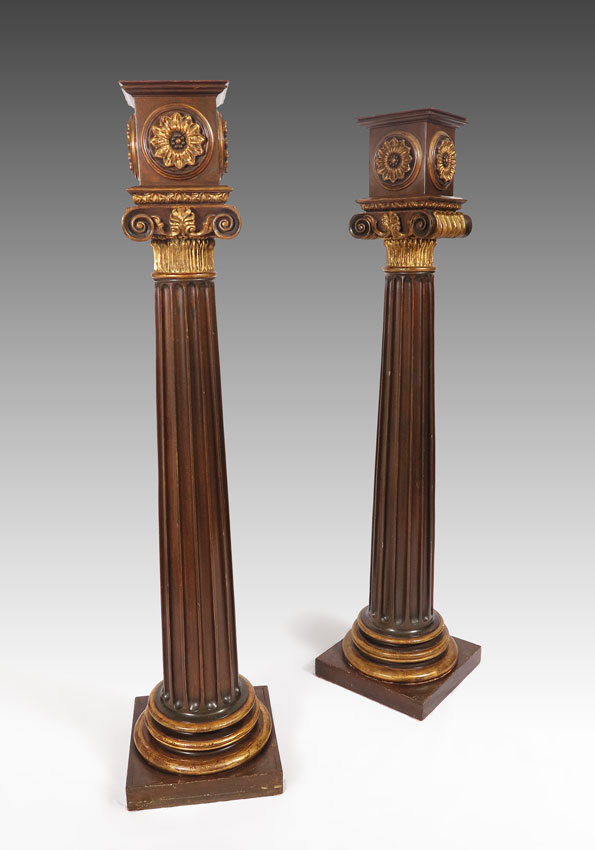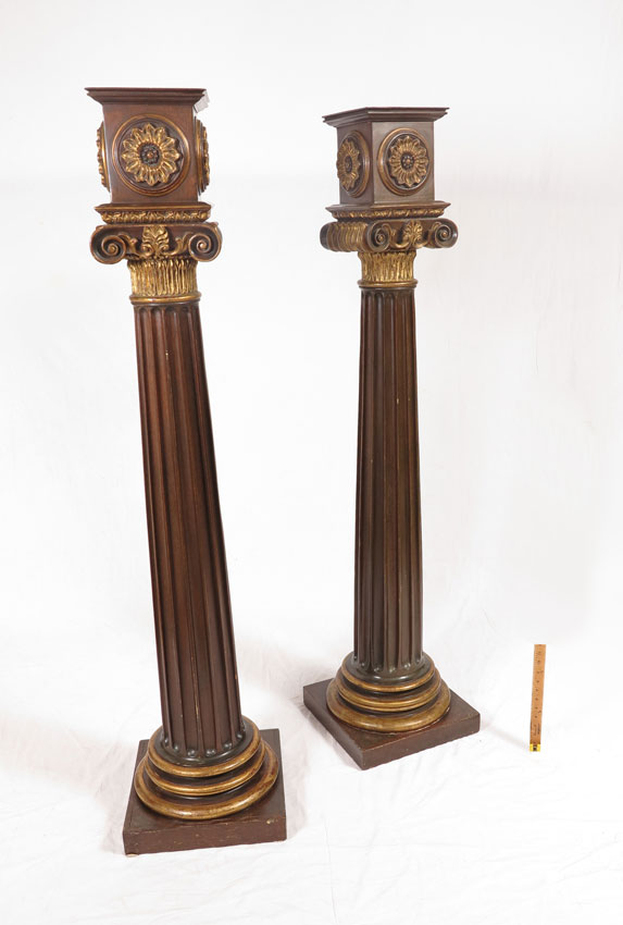 PAIR OF PARCEL GILT CARVED WOOD IONIC COLUMN FERNERS: Over 5 ft tall. Removable tin lining in the top. Approx. 61.5'' tall, the base 14.25'' square.