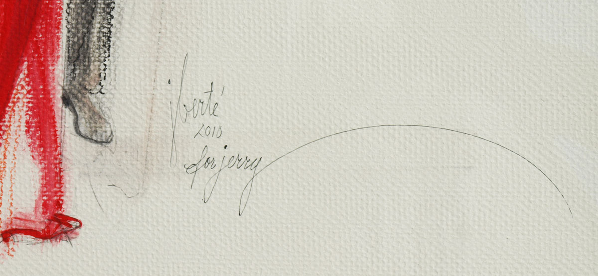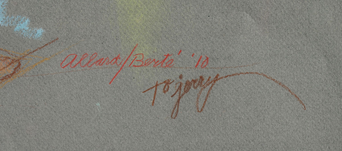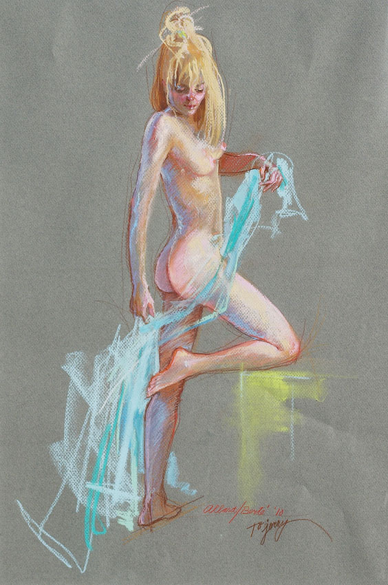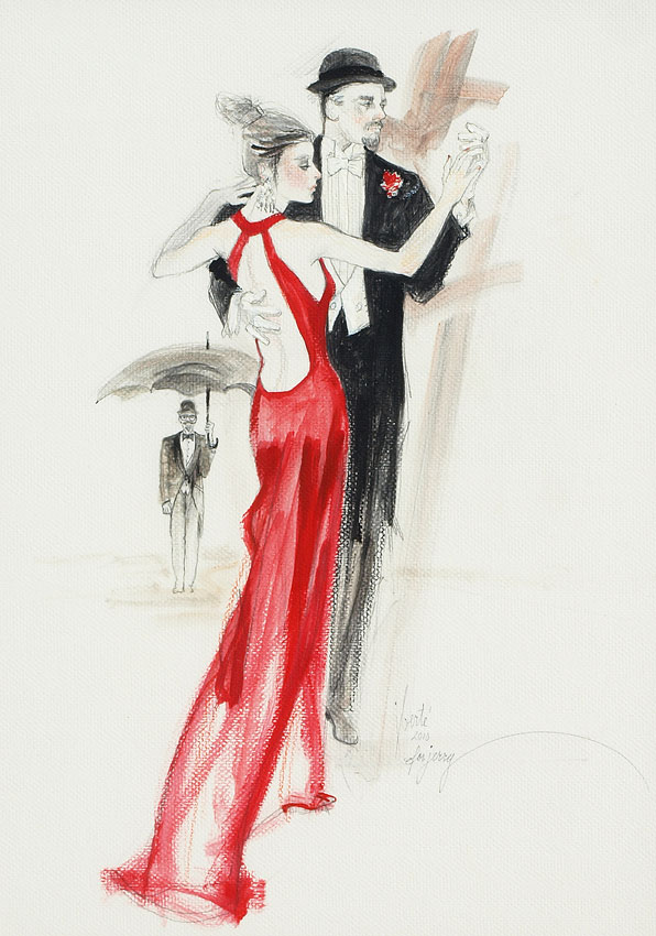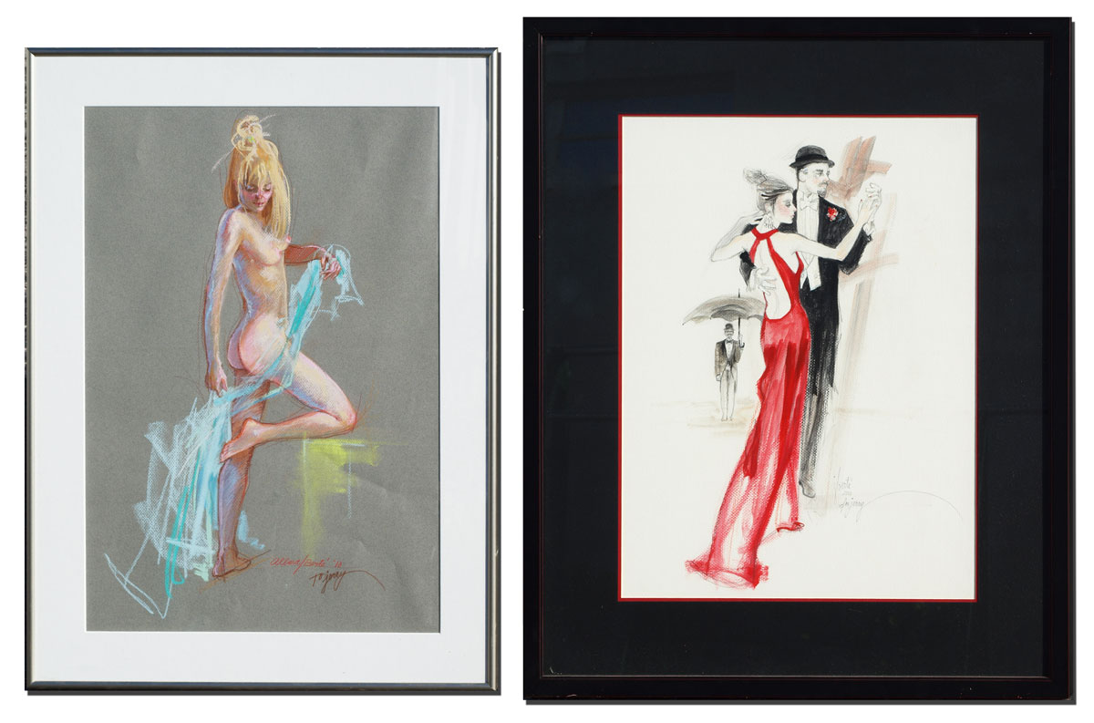 BERTE, Jean, (American, 20th Century): 1) Young Female Nude, Pastel, Sight size 23 1/4'' x 16'', signed lower right, dated '10, dedicated to Jerry, signed Allard/Berte, framed 29'' x 21 1/4''. 2) Pencil & Watercolor with Gouache Illustration Style Painting, Depicting a Couple Dancing with a Man holding an Umbrella looking on Smiling, Sight size 21'' x 16'', signed lower right, dated 2010, dedicated to Jerry, black frame with minor wear 29 1/2'' x 24 1/2''.