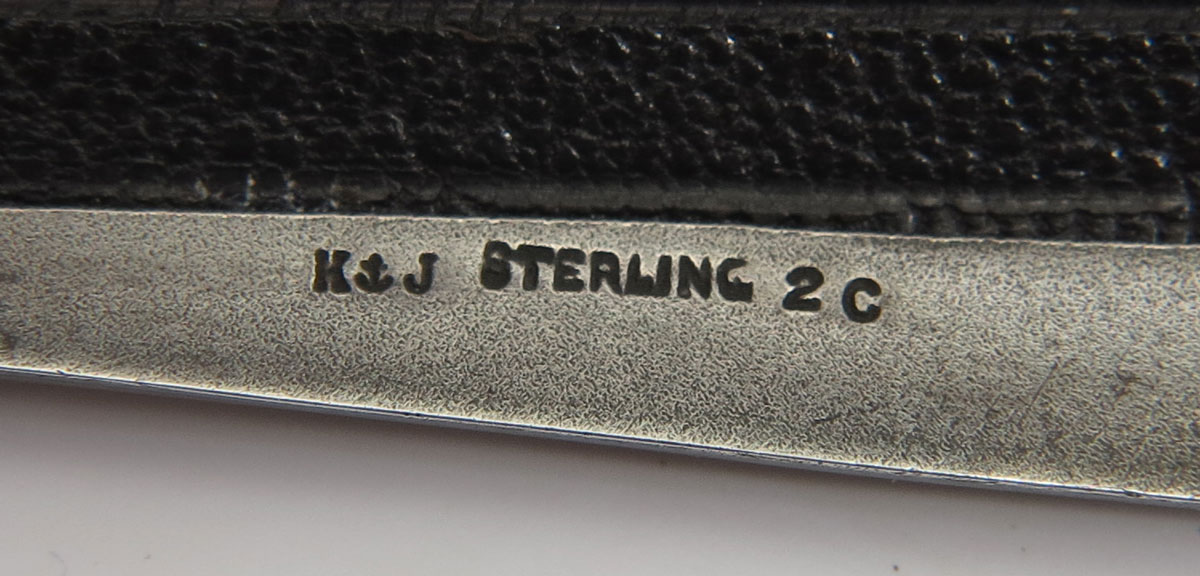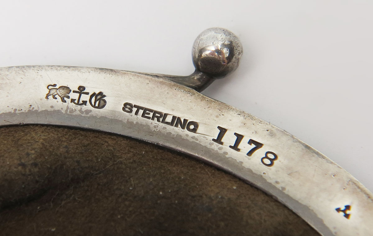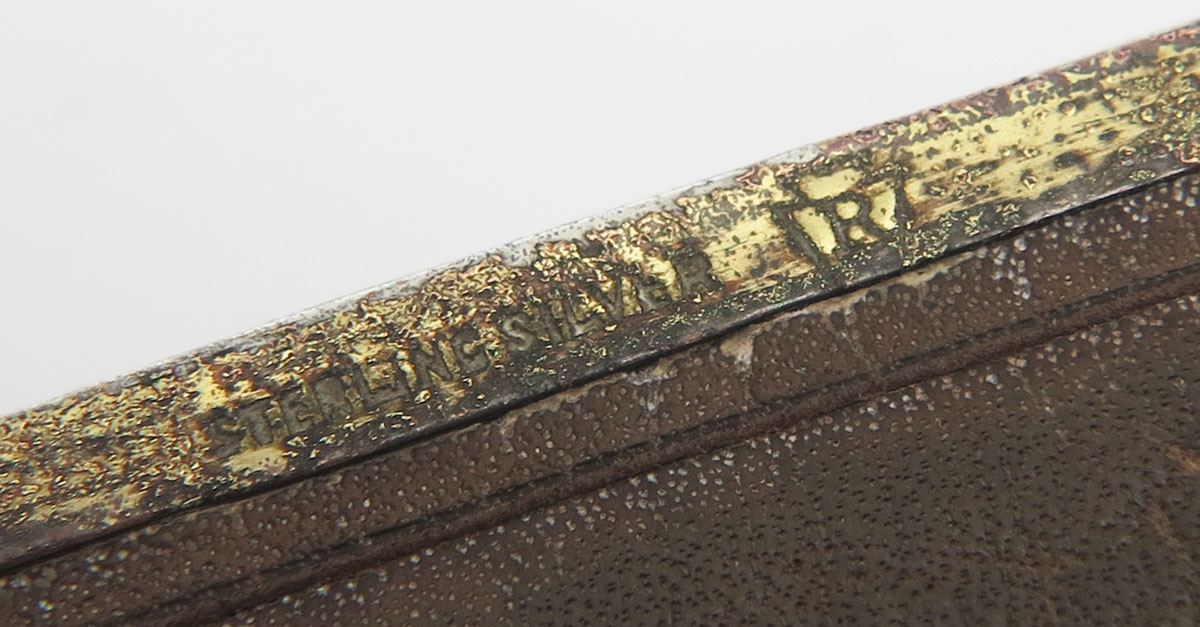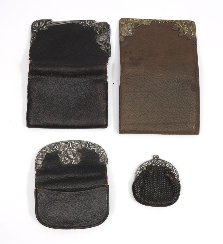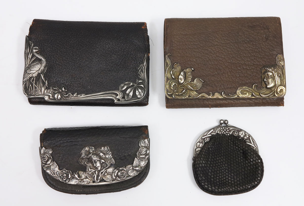 ART NOUVEAU STERLING SILVER PURSES AND RELATED ITEMS: To include; 1) Small circular sterling floral trimmed purse, Gorham, date mark for 1898. 2) Sterling trimmed change purse, Evangeline pattern, Unger Bros., Unger did not make the wallet. 3) Sterling trimmed leather wallet, woman at right, C.F. Rumpp & Sons, with original interior tag. 4) Sterling trimmed leather wallet, stork? at left, Kraus & Jantzen. Largest measures 4 1/2'' x 3 1/4''.