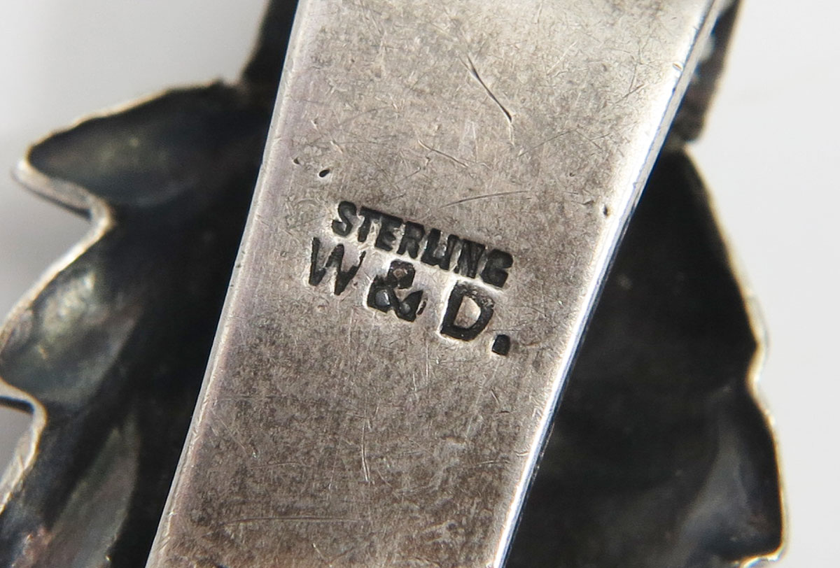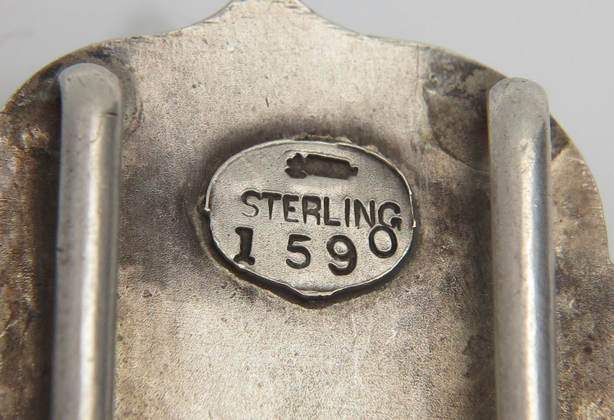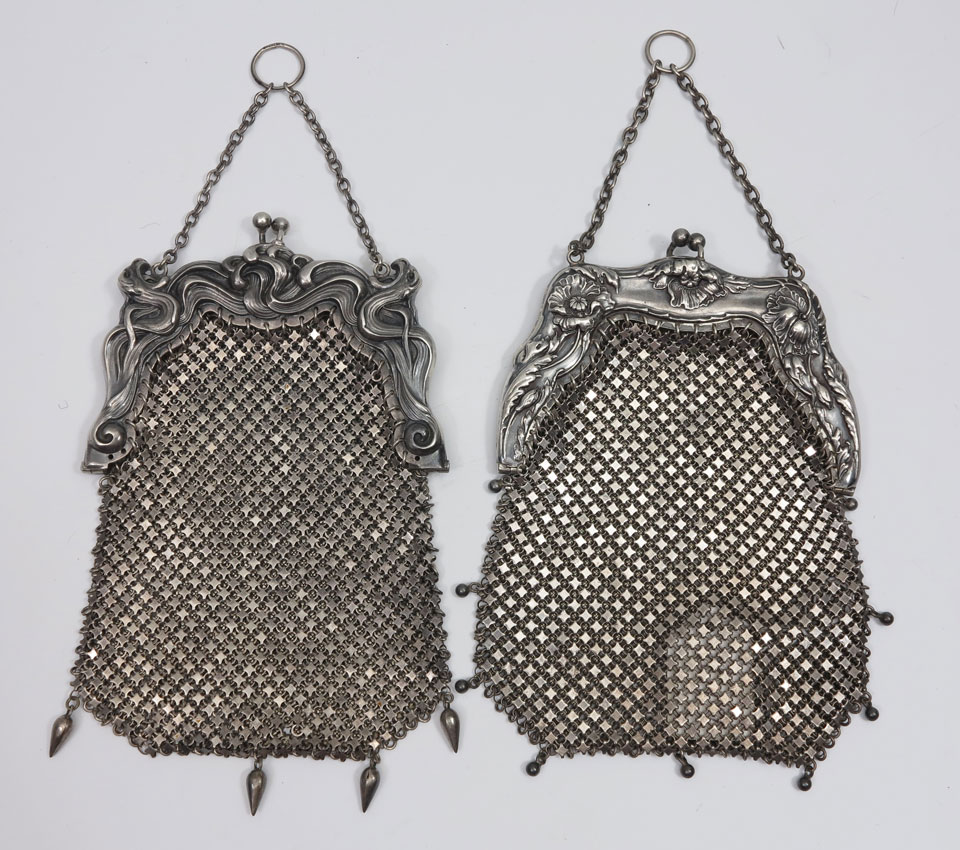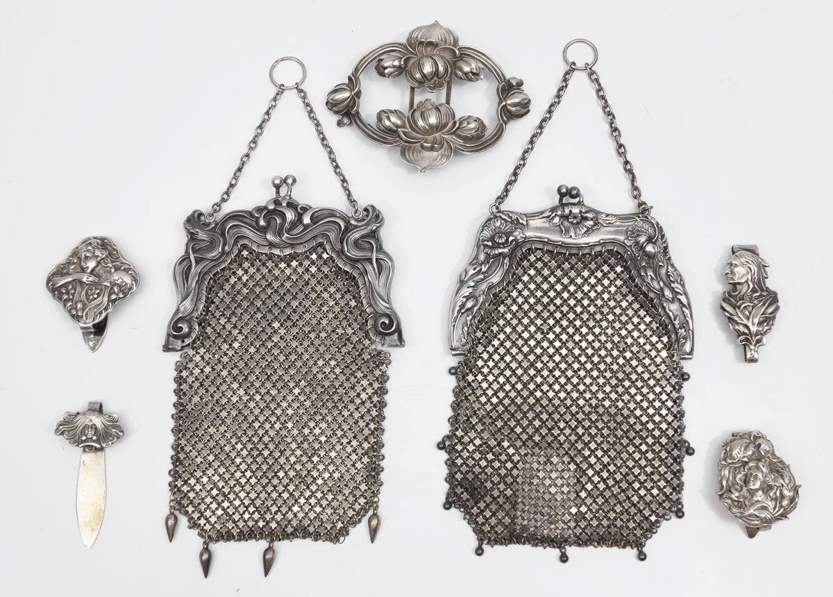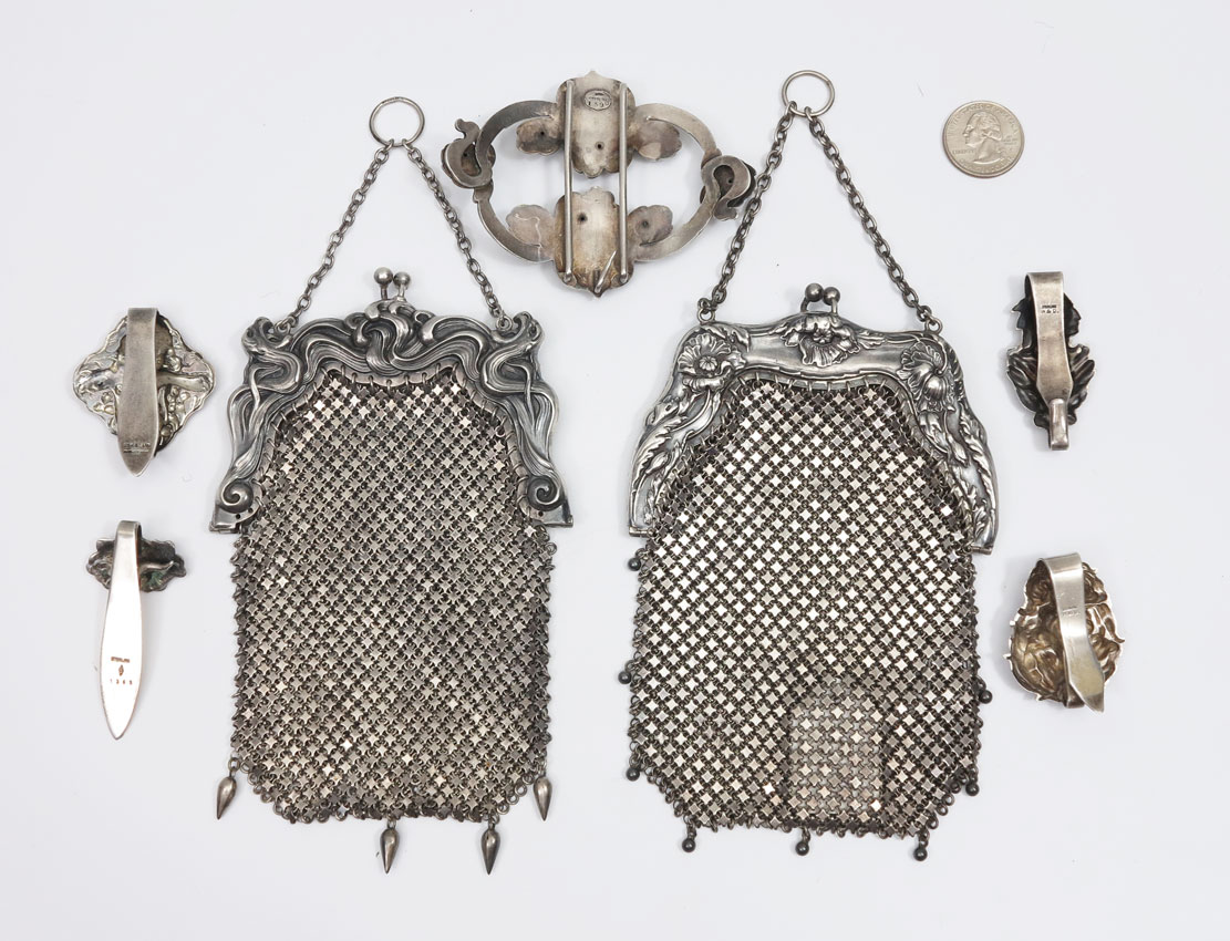ART NOUVEAU STERLING SILVER PURSES & RELATED ITEMS: To include; 1) Sterling framed mesh purse, art nouveau lines, Blackinton, missing one dangle; 2) Floral, Whiting & Davis; 3) 4 Sterling belt clips for evening bags and one buckle clip for evening bag. The buckle clip by Kerr. The Native American and woman looking upward by Whiting & Davis. (Native American very rare). The woman with hand at her chin by Blackinton. The woman with wild hair by Deitsch Bros., 5 pieces. Largest purse measures 5 1/4'' x 4'', 12.9 troy oz inclusive.