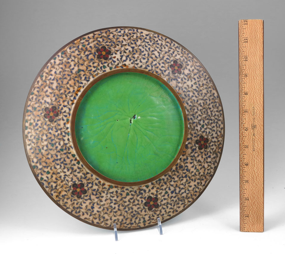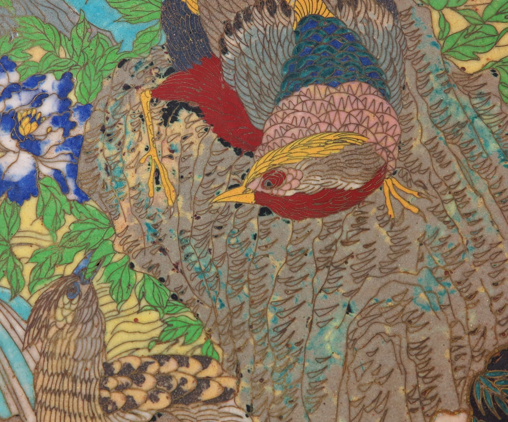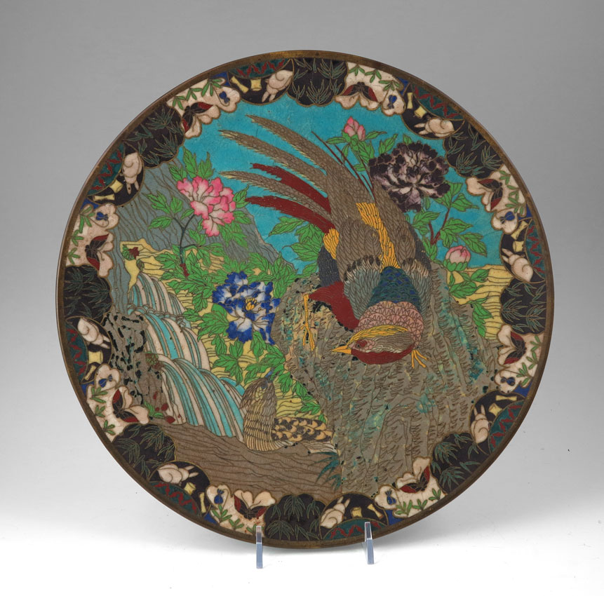 CHINESE CLOISONNE CHARGER: Bird of paradise with butterflies and floral motif. Unsigned, 12'' dia.