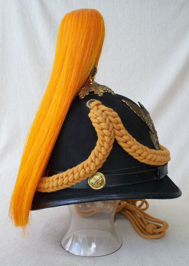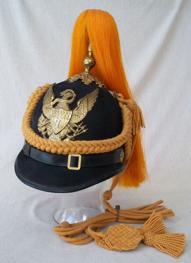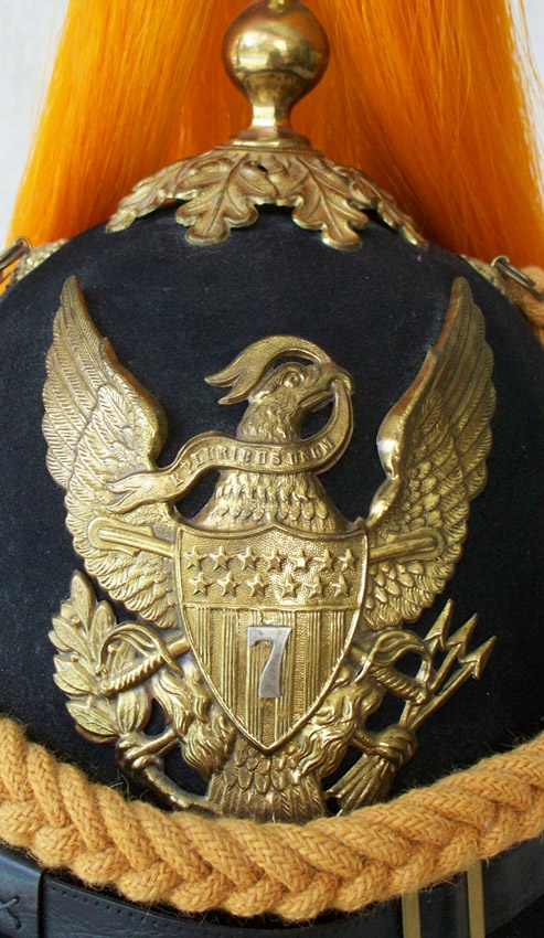 MODEL 1881 UNITED STATES 7TH CAVALRY HELMET: Indian Wars era, front badge with crossed swords behind shield on eagle's chest and 7th Cavalry designation. Marked Raymond & Whitlock, complete with cords. Measures 12 1/2'' h. x 10 1/2'' x 7 5/8''.
