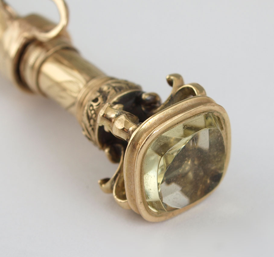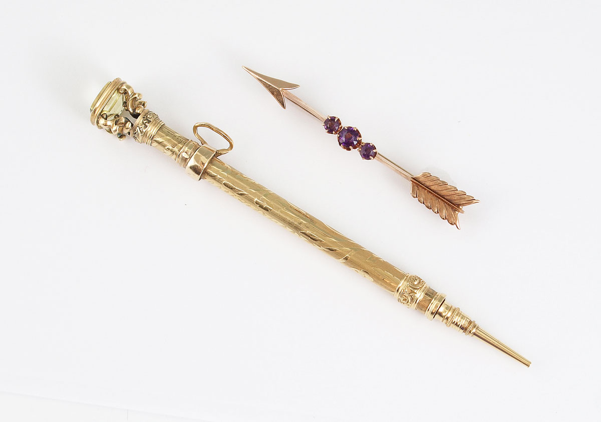 VICTORIAN GOLD PENCIL AND GOLD ARROW PIN: 14K yellow gold Victorian pencil, 4 1/2''L, with embossed body and a yellow stone of unknown origin, wearable on a chain. Sold with a Victorian arrow form pin of 14K rose gold with 3 amethysts, 2 1/2'' L. Weight: 21.1 grams.