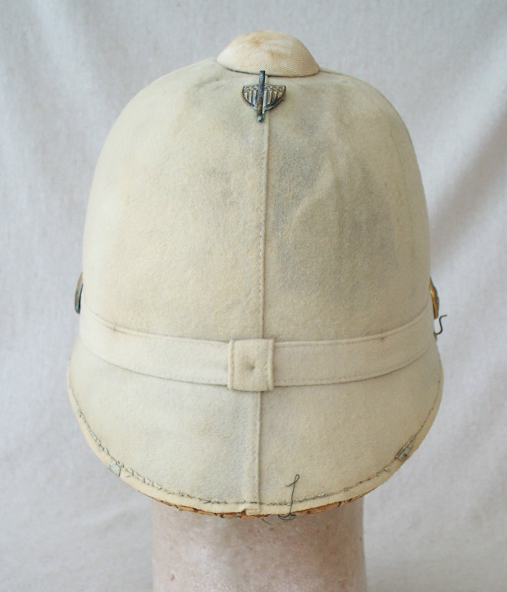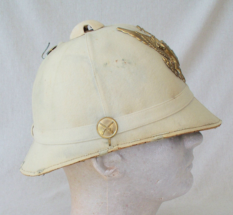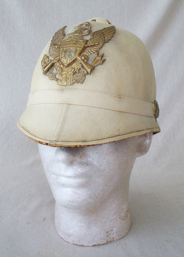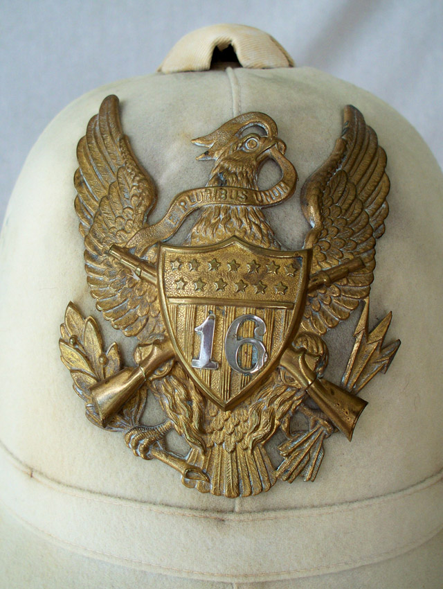 UNITED STATES INFANTRY PARADE PITH HELMET: Spanish American War era, large gold plated eagle badge on front with shield having 13 stars surmounted over stripes. Attached is the numeral 16 in silver metal representing the 16th Infantry. Eagle shield is over two crossed rifles, signifying infantry. 7'' h. x 11'' x 8''.
