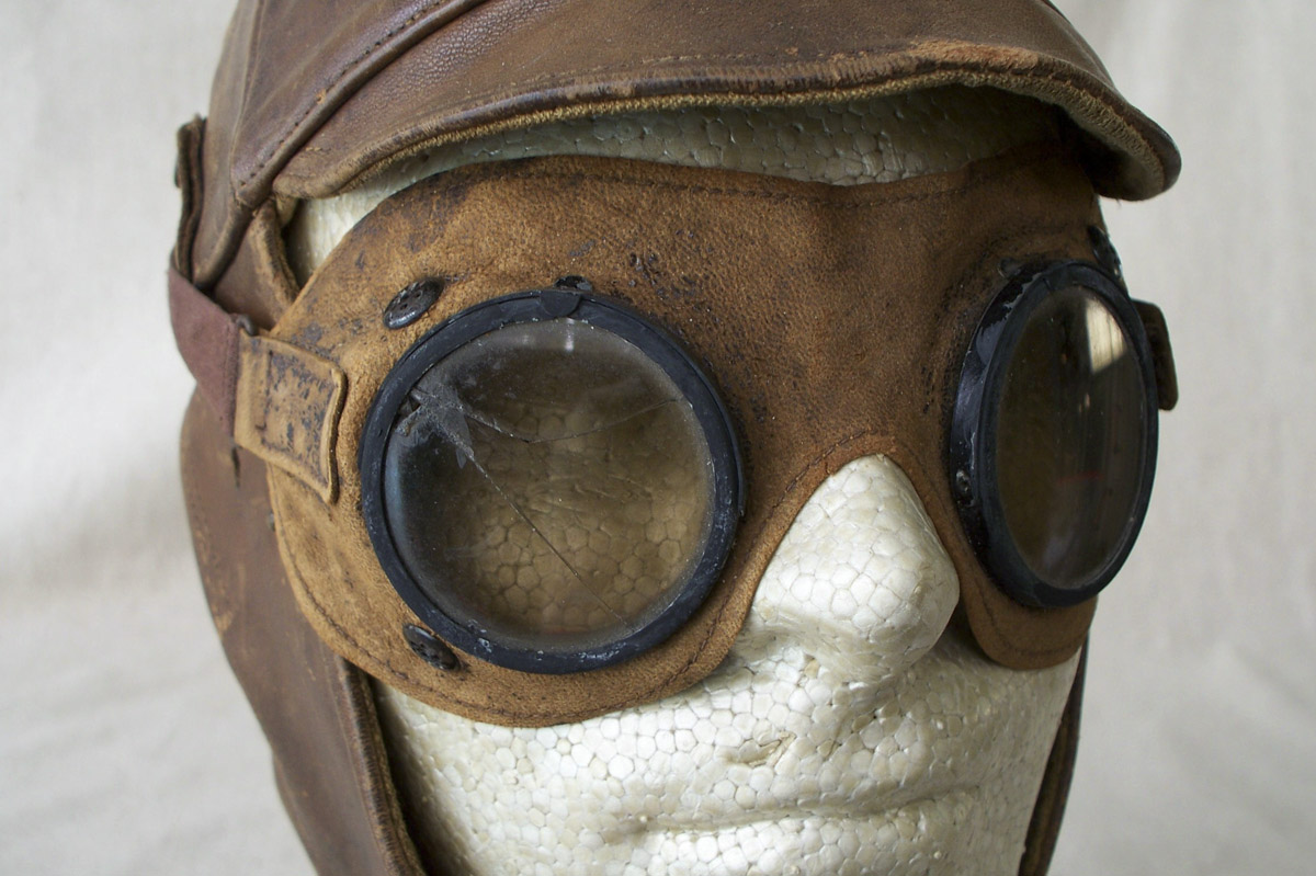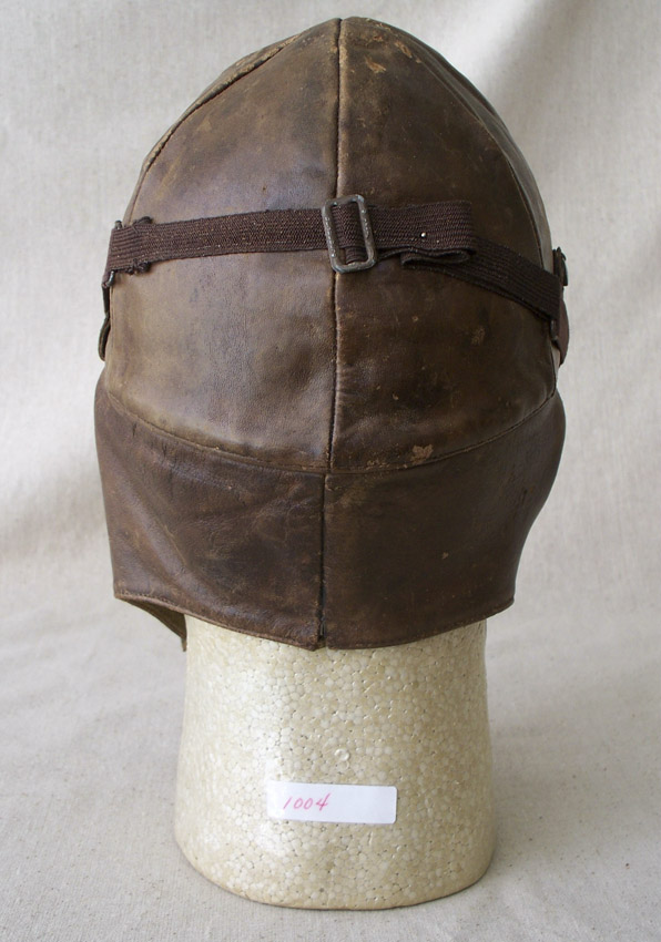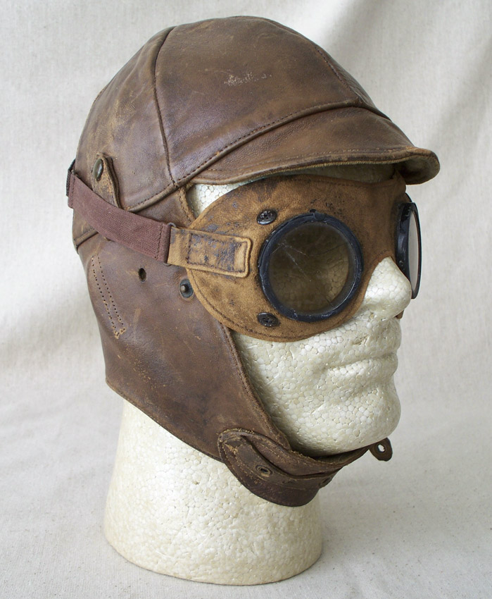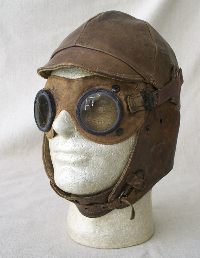 LEATHER AMERICAN MANUFACTURED FLIGHT HELMET WWI: The helmet has the name of the pilot C. F. Barth and serial number 96SAPS written on it by him. This helmet was obtained from the son of the pilot who died many years ago. Sold with styrofoam head mount, overall 11 3/4'' h. x 8 1/4'' x 6''.