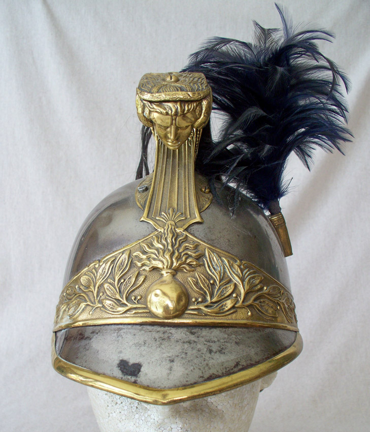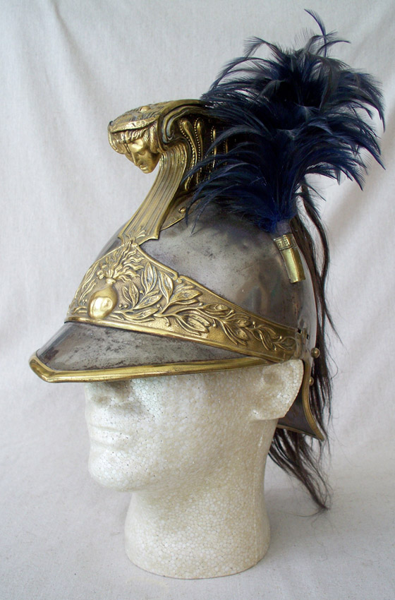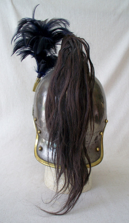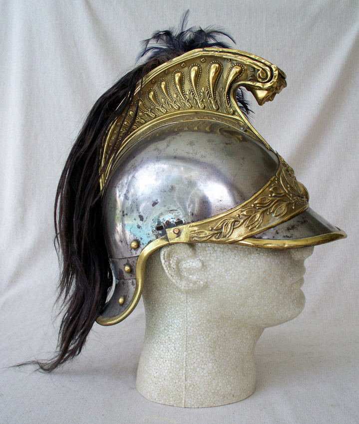WWI FRENCH CAVALRY CUIRASSIER HELMET: Top brass comb with horsehair and figural Medusa masqueron. Flaming bomb with foliate decoration front plate, solid lobster tail rear. Helmet base outlined in brass. Missing chinstrap. Overall measures 10'' h. x 11 3/8'' x 7 1/4''. Sold with the styrofoam head mount.