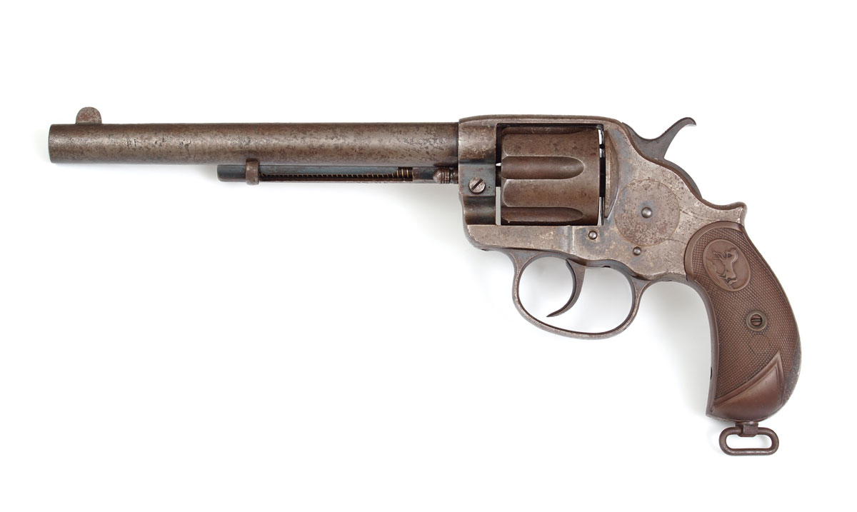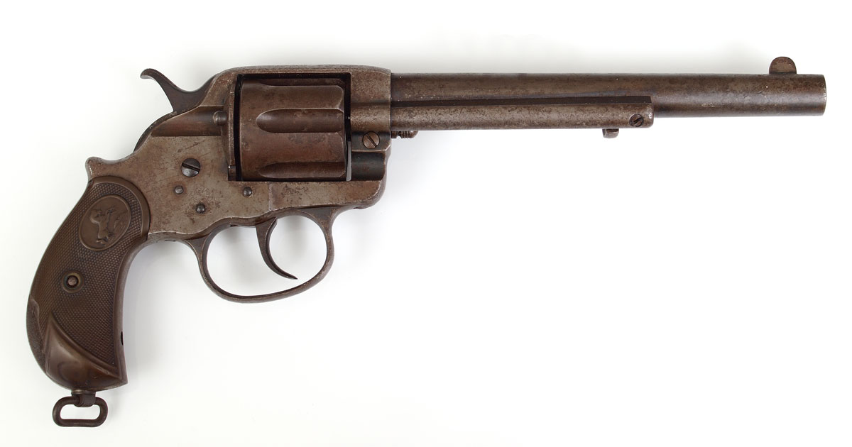 COLT MODEL 1878 DA ANTIQUE PISTOL: 7 1/2'' .45 caliber barrel marked Colt's Pt. F. A. Mfg Co. Hartford Conn. along top, 45 Colt on side. 6 shot fluted cylinder, hard rubber grips. Serial number 32057, dates pre 1898. Traces of original fire blue remain in protected areas. Double action works fine. Overall 12 1/2'' long.