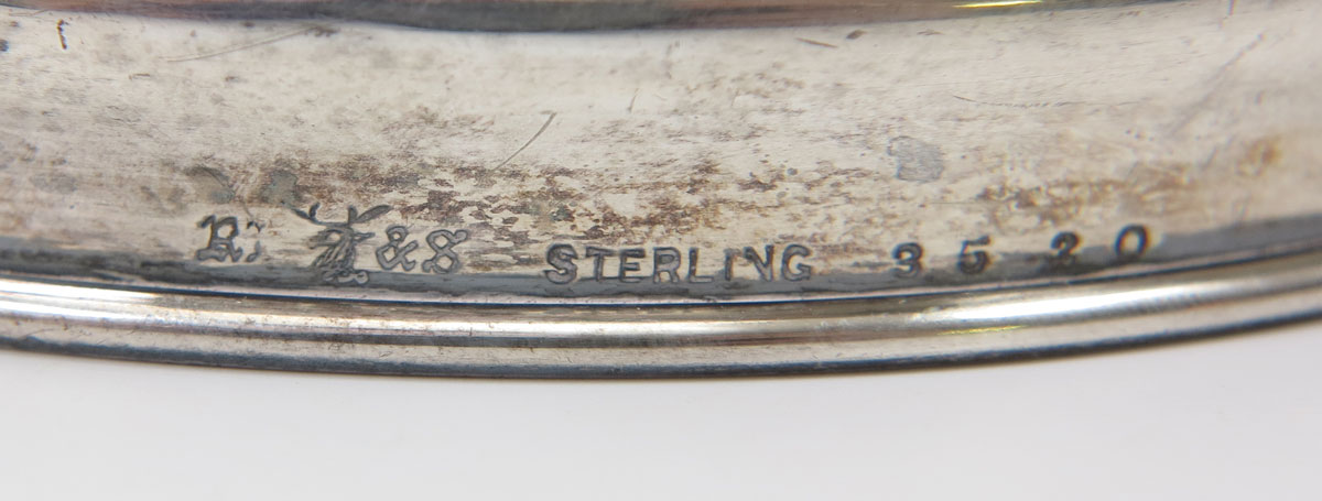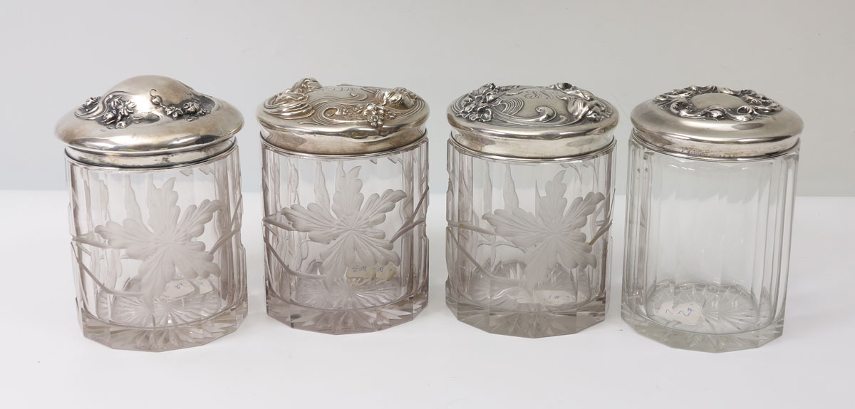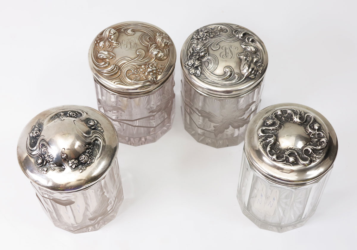 ART NOUVEAU STERLING SILVER LIDDED CIGAR HUMIDORS: To include; 1) Sterling Lidded Crystal Humidor, flowers around, original sponge bar beneath; 2) Sterling Lidded Crystal Humidor, swirls around, Wallace; 3) Sterling Lidded Crystal Humidor, flowers with swirls, original sponge bar beneath, marked sterling; 4) Sterling Lidded Crystal Humidor, flowers around circumference, marked sterling, Woodside. All monogrammed.