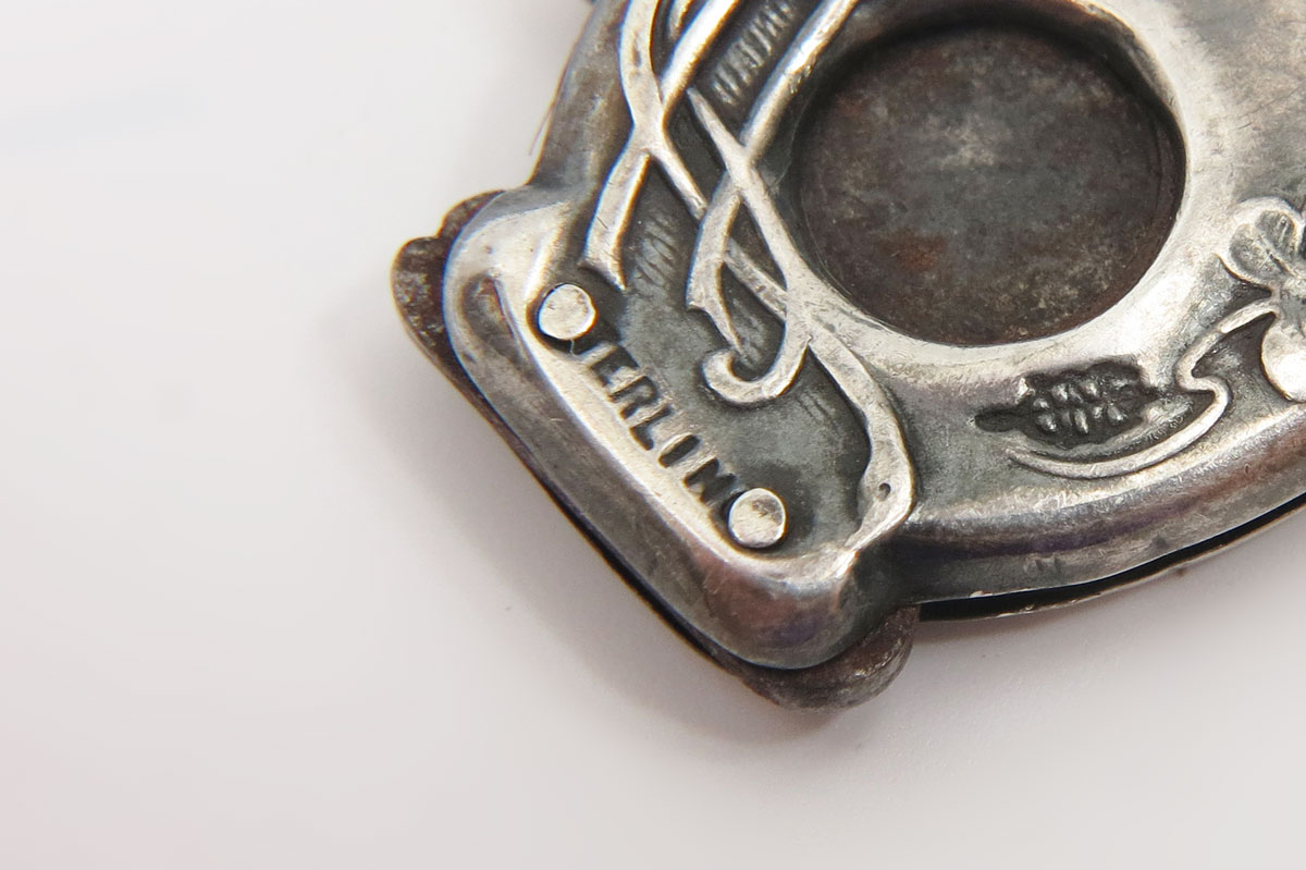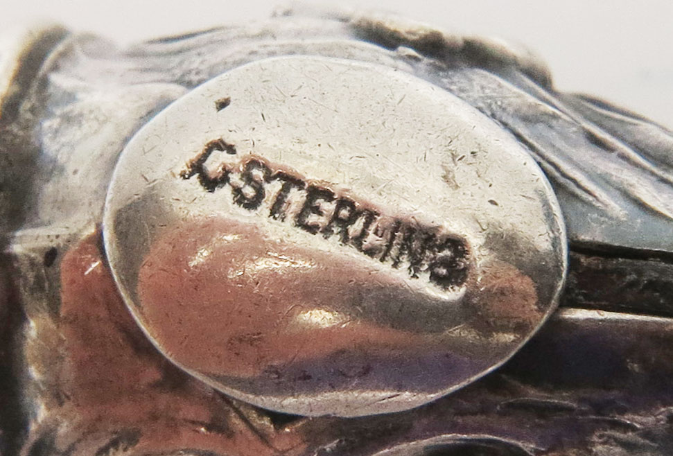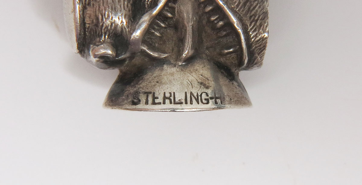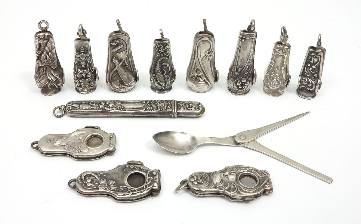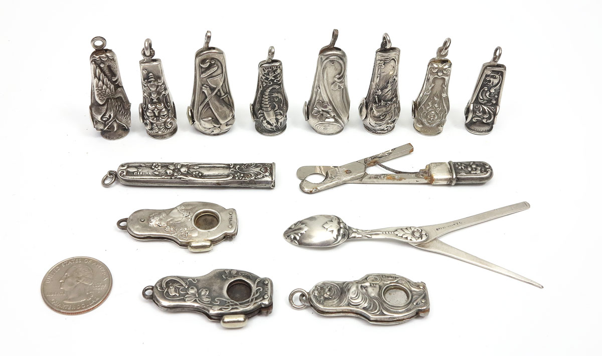 ART NOUVEAU STERLING SILVER CIGAR CUTTERS: 12 cigar cutters for fob or vest pocket, and one pipe tool. All marked sterling. Cigar cutters: 3 women, 3 creatures (dog?), lobster and north wind or devil; the lobster being of exceptional rarity and griffin), 4 floral (including one in a small case), 1 merrymaking. 13 pieces. Longest measures 3'', 3.9 troy oz. inclusive.