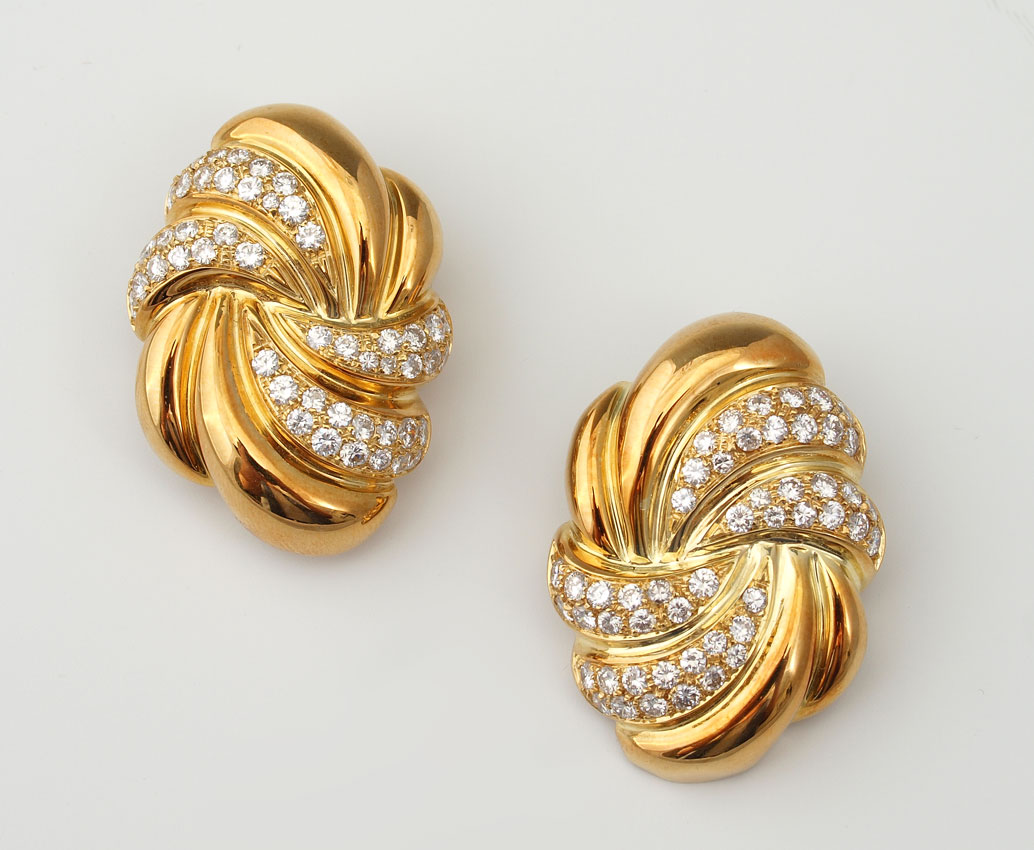 4.00 CTW DIAMOND FASHION EARRINGS: 18K yellow gold earrings contain 100 round brilliant cut diamond totaling approx. 4.00 Ct. Approx. The diamonds average VS in clarity and G-H in color. The diamonds are pave set. Post and hinged clip closures. Length 1.25''. Weight: 21.9 grams.