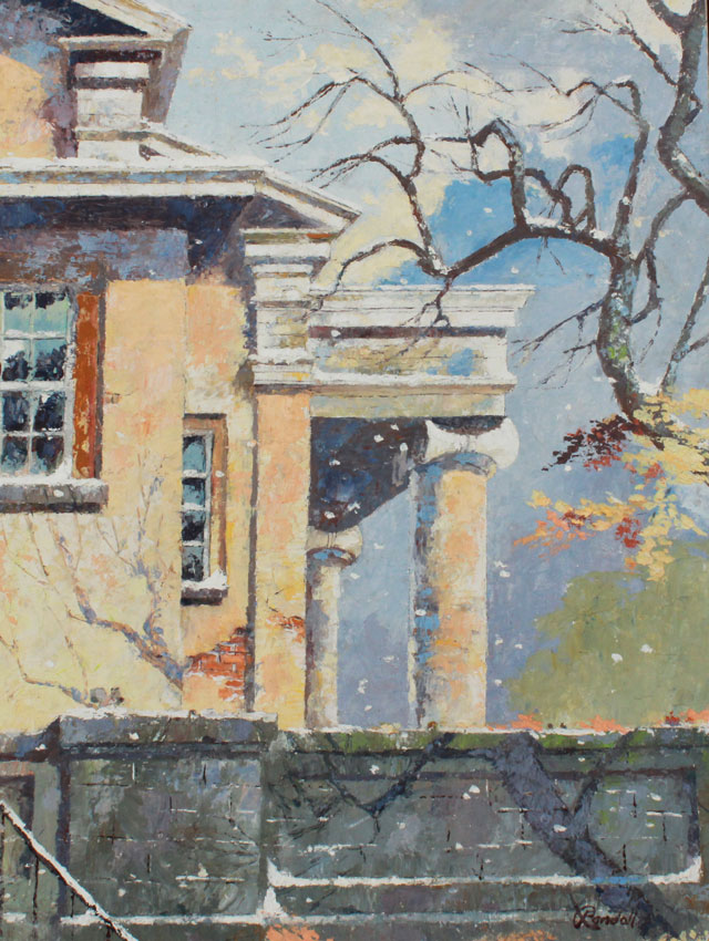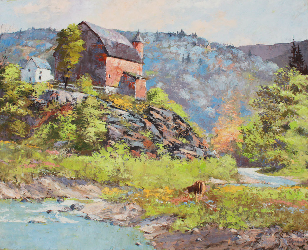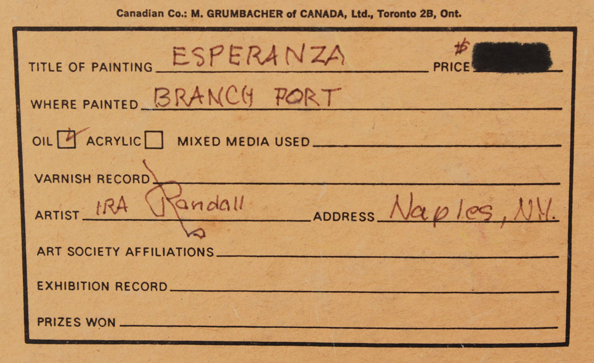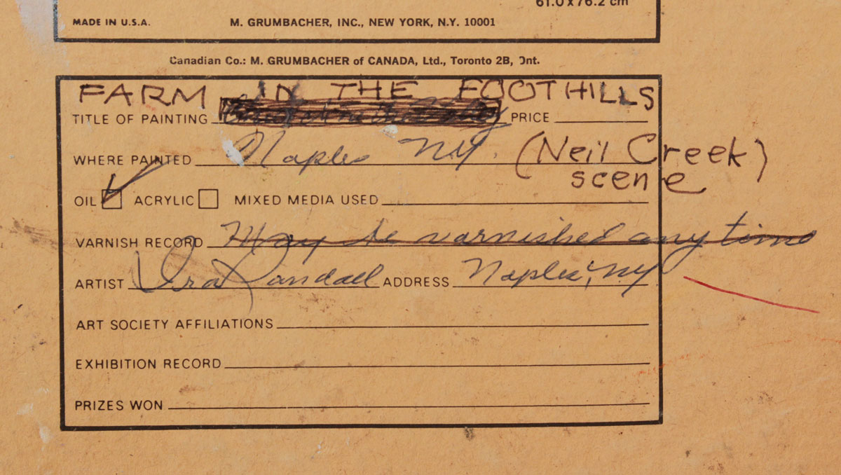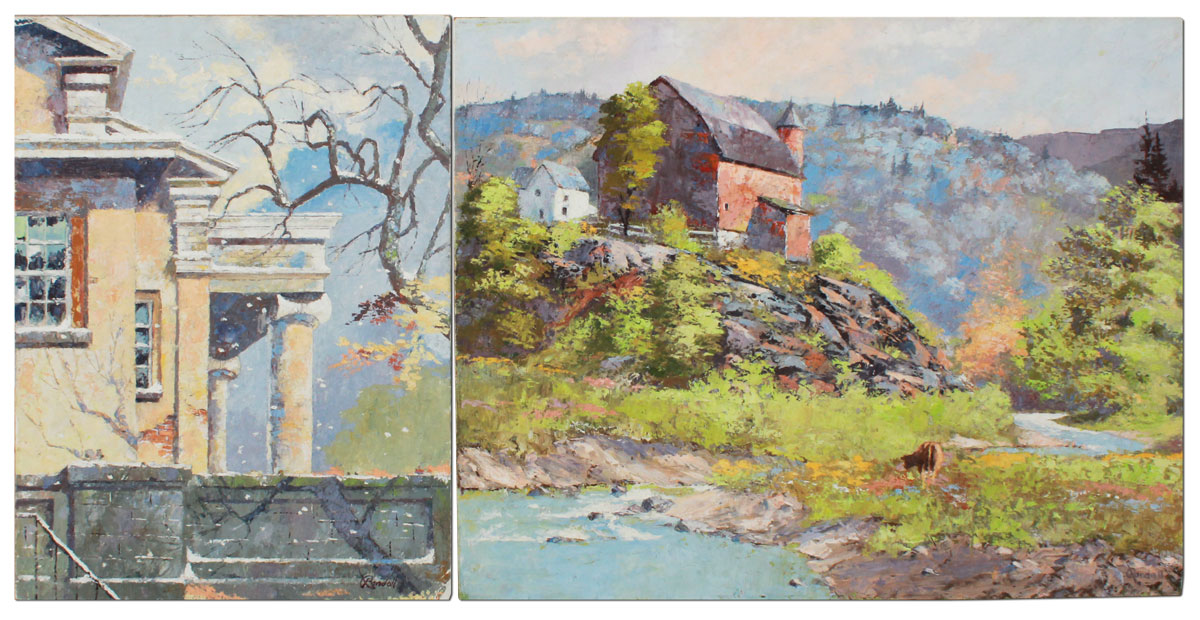 RANDALL, Ira, (American, 20TH Century ): Two piece lot of Oil/Canvasboard, Scenes depicting Naples, New York to include; 1) ''Esperanza'', of the Esperanza Mansion in New York, which was completed in 1838, 24'' x 18'', signed lower right, titled verso, unframed. 2) ''Farm in the Foothills, Neil Creek Scene'', 24'' x 30'', signed lower right, titled verso, unframed.
