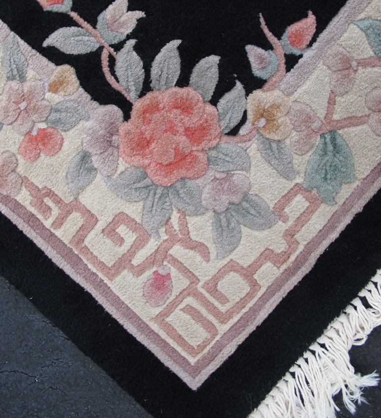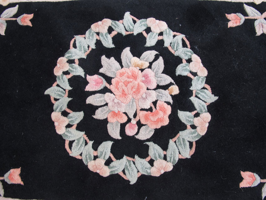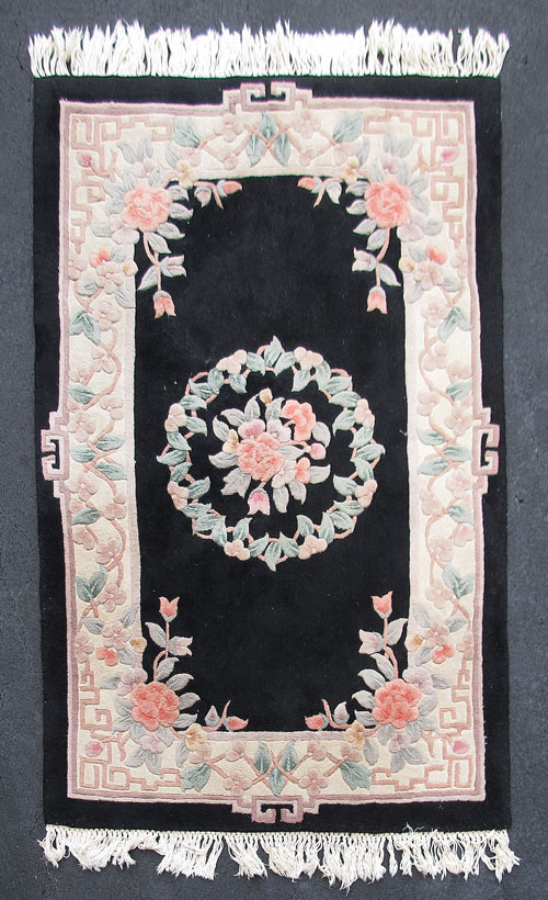 MODERN CHINESE HAND KNOTTED WOOL RUG, 42'' x 72'': Black ground with center circular medallion composed of peach, pink, green and mauve flowers. Corners of the field have a large peach flower overlaid between the edge of the field and the main border. The main border has an ivory ground with lattice work motif interspersed with vines of leaves and flowers. Condition is good.