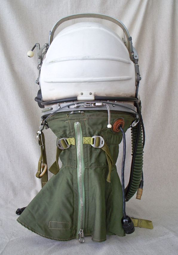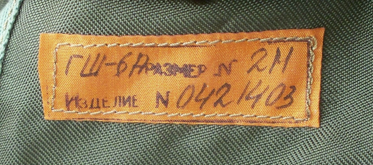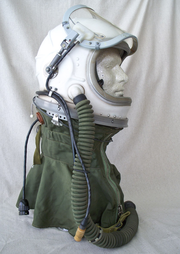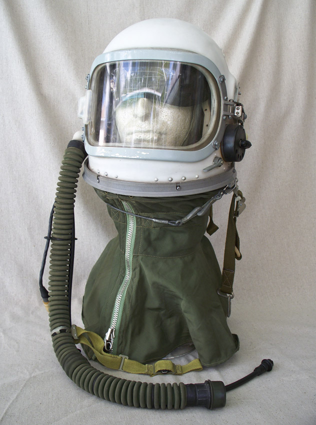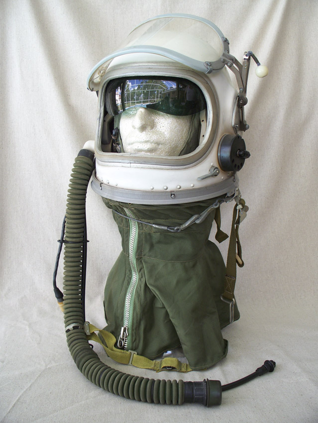 USSR ZSh-3M HIGH ALTITUDE FLYING HELMET: PS is issued in a typical Russian wooded container with KM-32 mask. Shz-82 winter helmet, ShL-82 summer helmet, LA-4 throat microphone and clear lens goggles for night flying. Introduced in 1968 the GSH-6A differs from GSH-6M in several ways. Most notable is the oxygen intake and emergency oxygen regulator is reversed. It is used in Su-15, MIG 21, MIG23, and MIG 25 fighters. The two-part rotating neck ring is replaced by one-piece. Orange skirt tucks into BMCK-4/VKK-6MP-1 partial-pressure suit. GS-6AA introduced in 1980, differs only in that it has 8 pins instead of 6 connector pins to attach to the neck ring. It is used in the MIG-31. Sold on styrofoam head mount and glass under mount, overall displayed 22 1/2'' h. x 9 3/4'' x 11''. Sold with container.