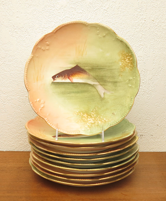 10 HAND PAINTED FRENCH LIMOGES FISH PLATES: A. Klingenberg. Artist signed, scalloped and beaded rim, 9 1/2'' dia.