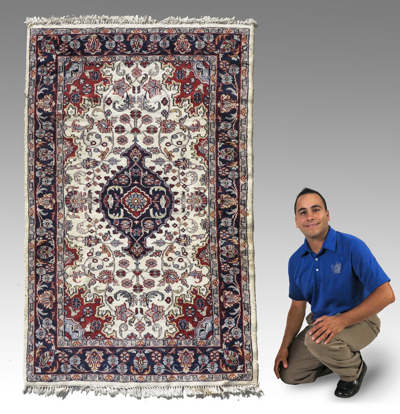 PAKISTANI PERSIAN HAND KNOTTED WOOL RUG, 49'' x 74'': This rug has a white field with a dark blue border and central medallion, red rust and medium blue corners, the same colors are repeated throughout the rug.