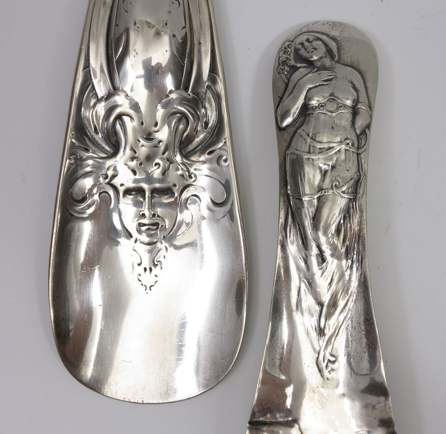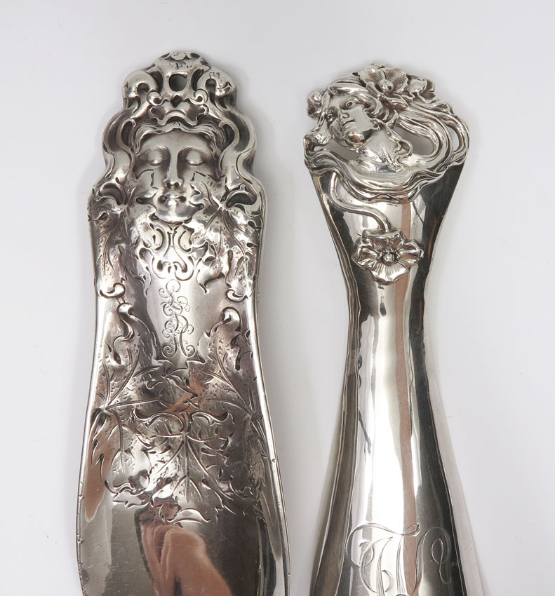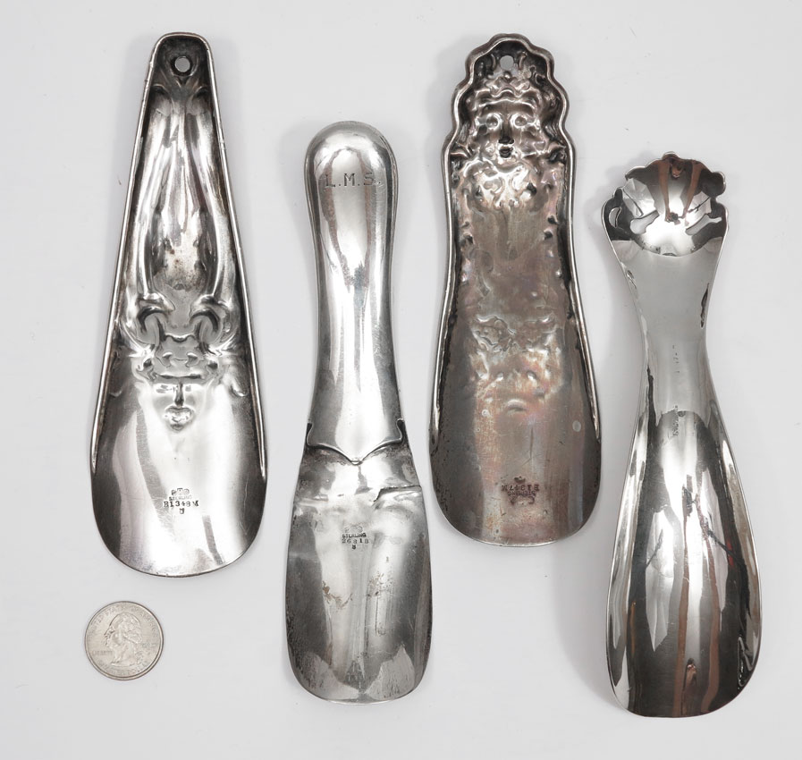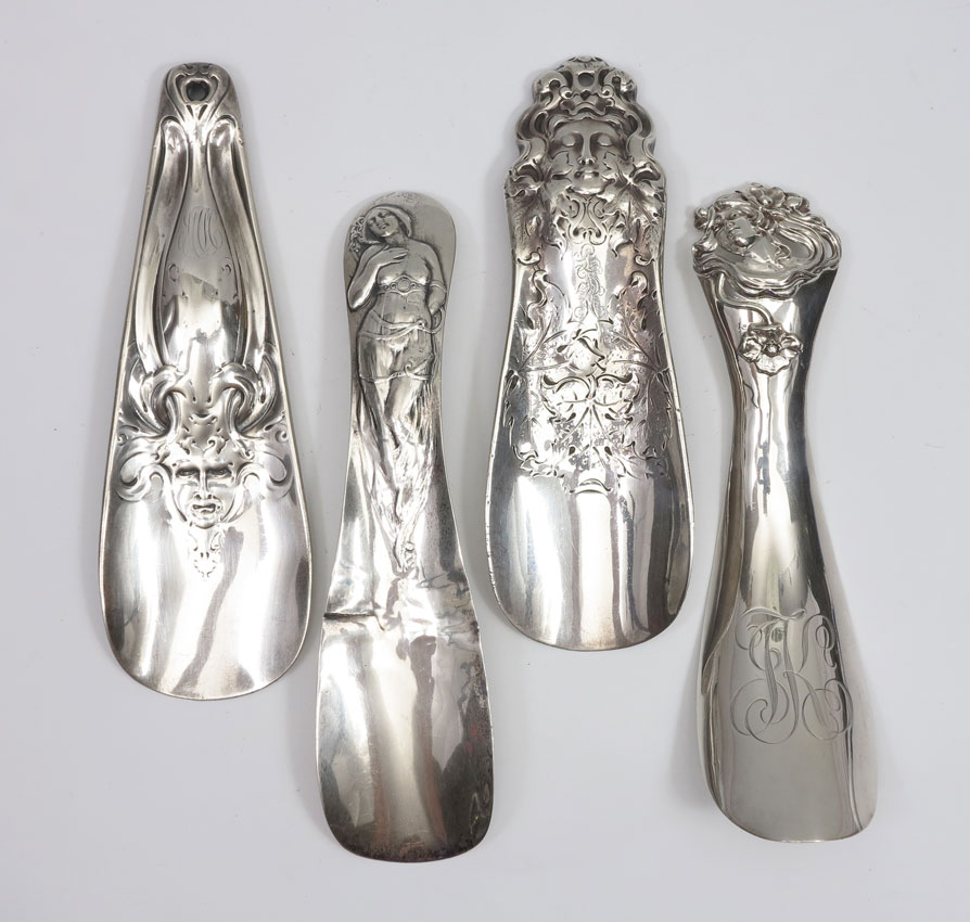 ART NOUVEAU STERLING SILVER SHOE HORNS: To include; 1) Full woman's body, crimped and tear, Gorham, date mark for 1904; 2) Medusa like woman's face in middle, Gorham date mark 1903; 3)Woman's face with closed eyes atop, Gorham date mark 1912(?) 4) Woman's head atop looking to her right, Kerr. All monogrammed. 9.7 Troy oz.