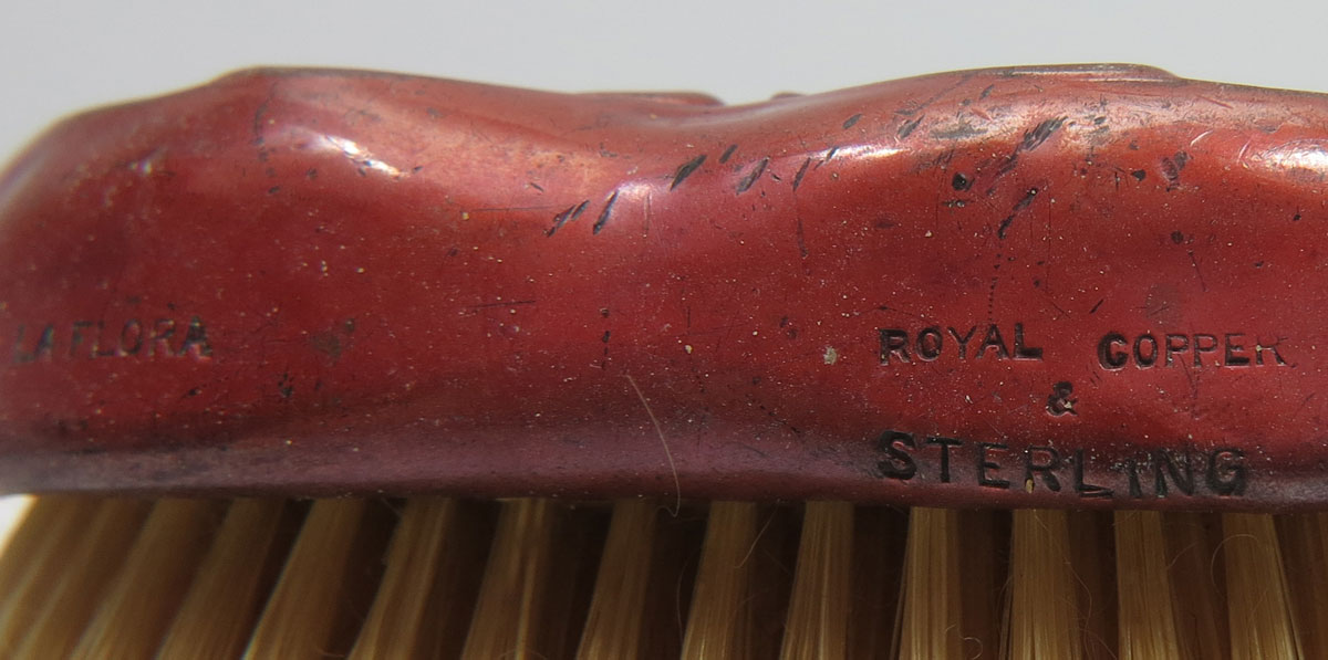 ART NOUVEAU STERLING SILVER BRUSHES: Mixed metal hairbrush and clothes brush. Incredibly rare. Both marked Royal copper and sterling. Hairbrush also marked La Flora. Note: frames are likely American. Sterling plaques look European, but cannot be examined out of frame without destroying the items.