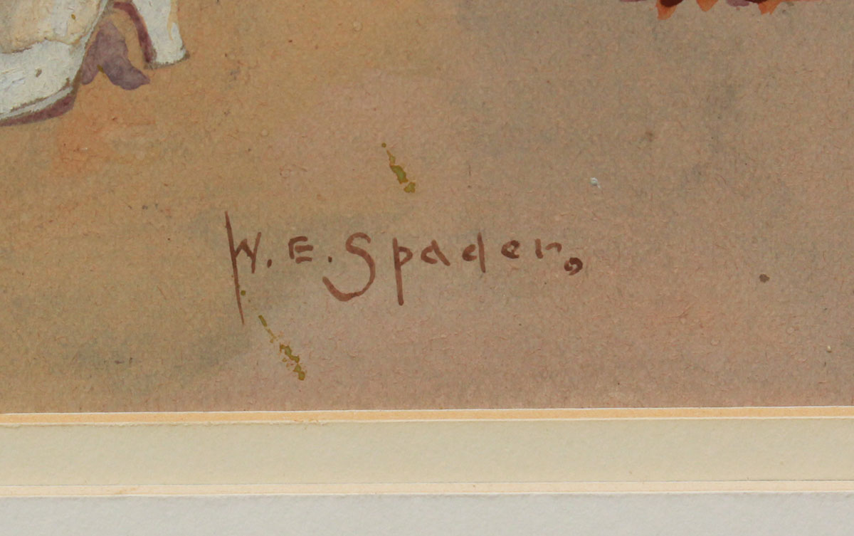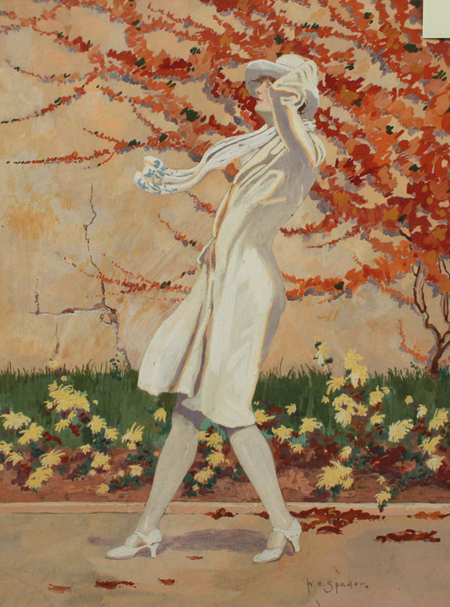 SPADER, William Edgar, (American, 1875-1954): Young Lady Wearing White Holding her Hat in an Autumn Breeze, Watercolor/Gouache, 13 1/4'' x 10 1/8'', signed lower right, matted but unframed, overall size 18 3/4'' x 15 1/4''.