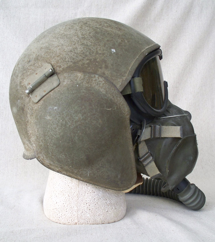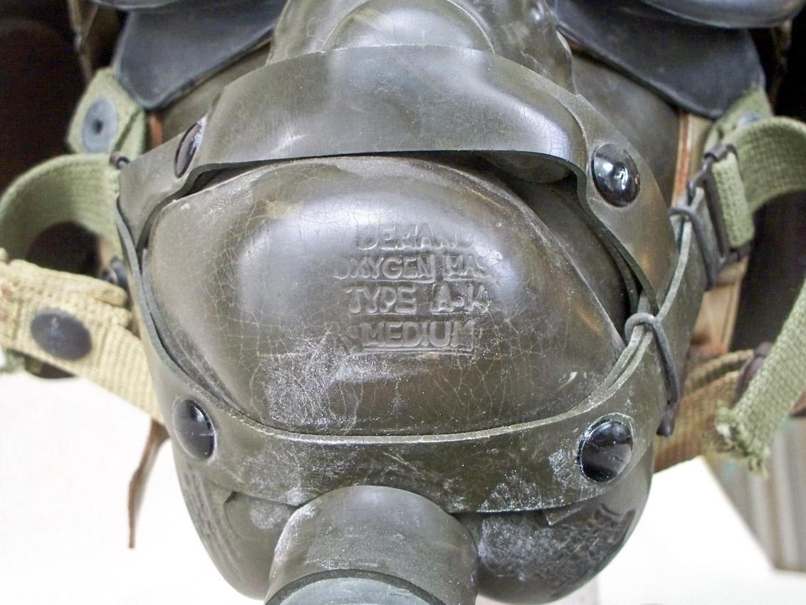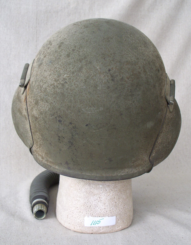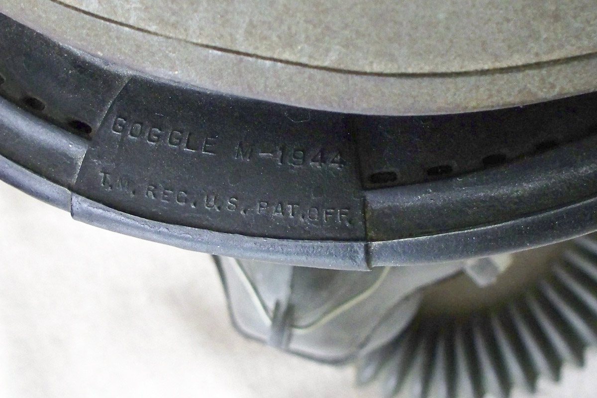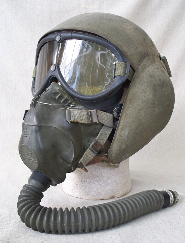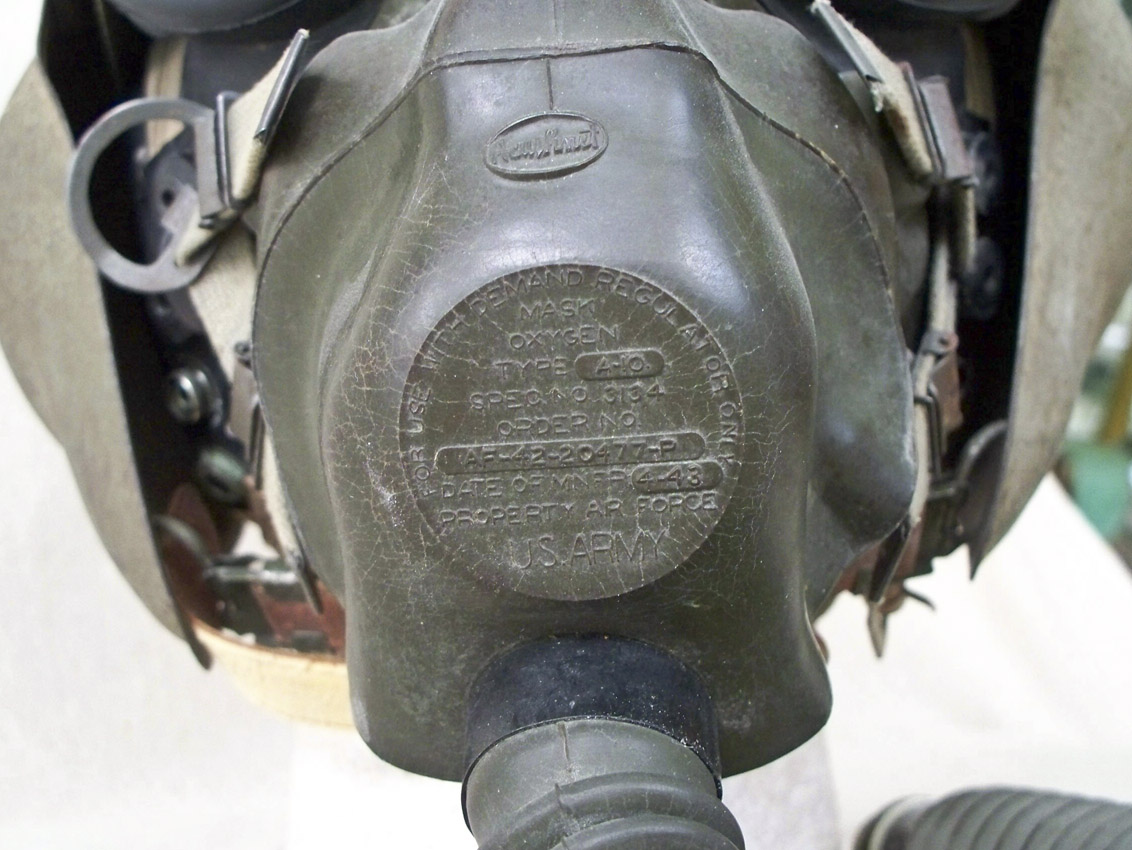 M-5 US ANTI FLAK HELMET: Interior flight helmet AN-H-15 Bates Shoe Company, size large. Bates Shoe Company Army Air Force, Oxygen mask A-10. Goggles M-1944. Sold on styrofoam head mount, overall 12'' h. x 9 3/4'' x 11''.