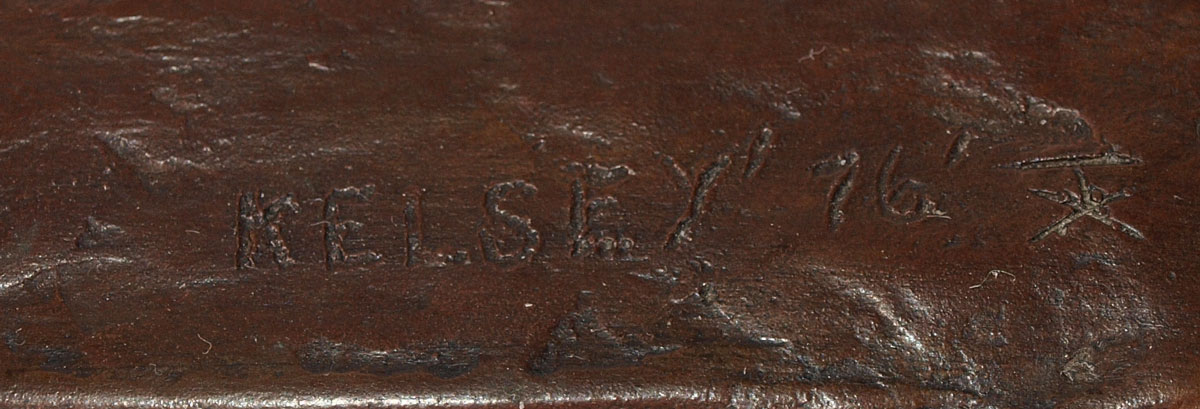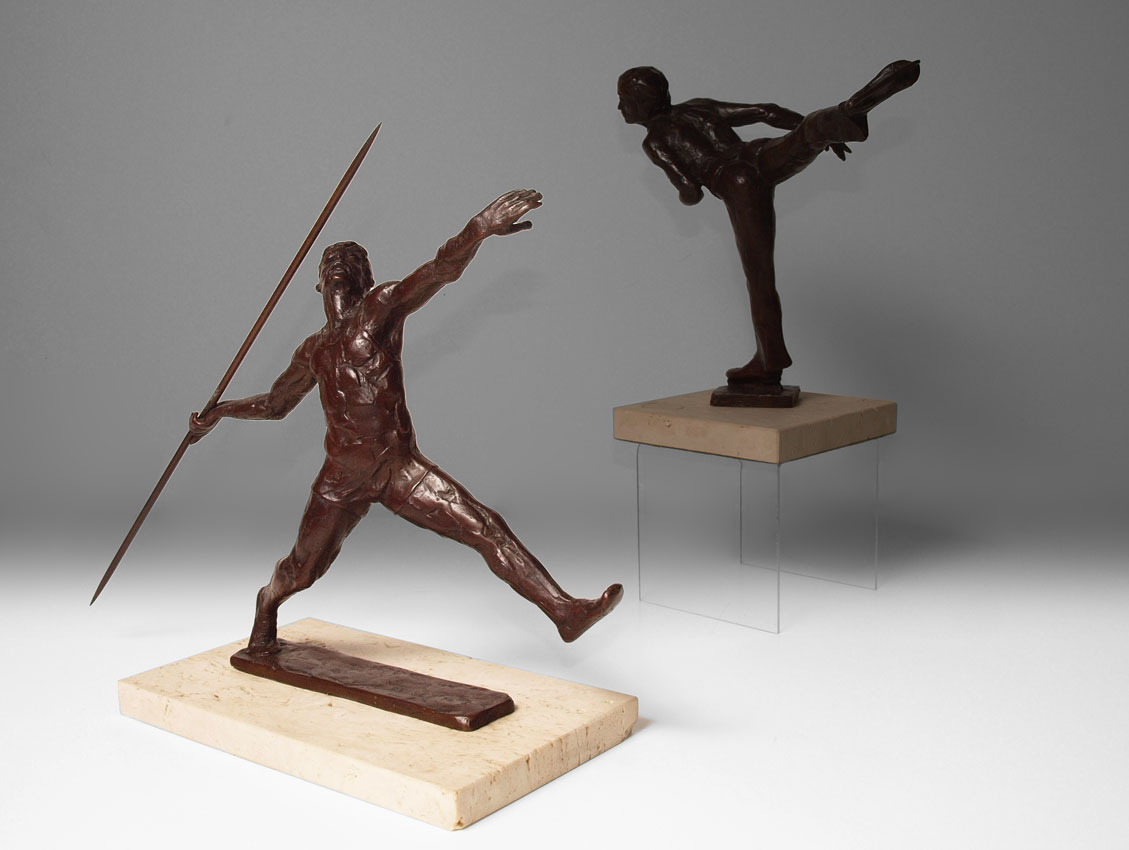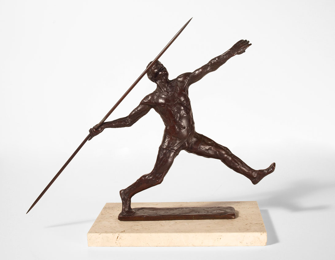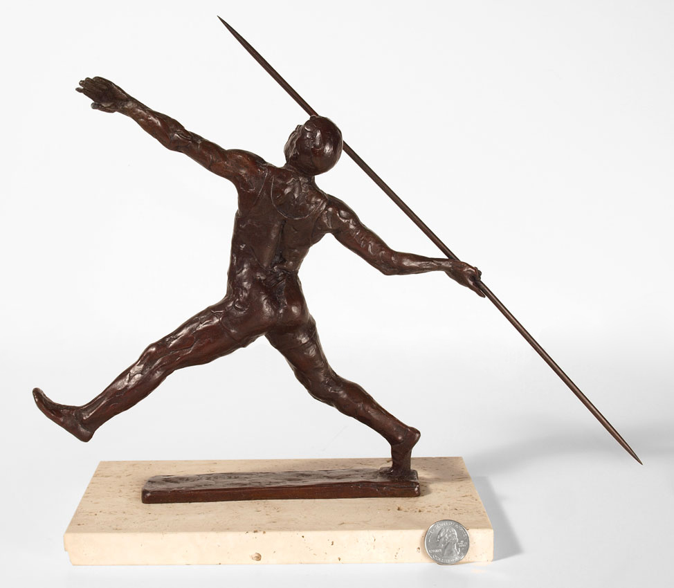 JAVELIN THROWER BRONZE: 10 1/2'' h., 13 1/2'' w., affixed to a travertine stone plinth, incised signature to the base, dated '77.