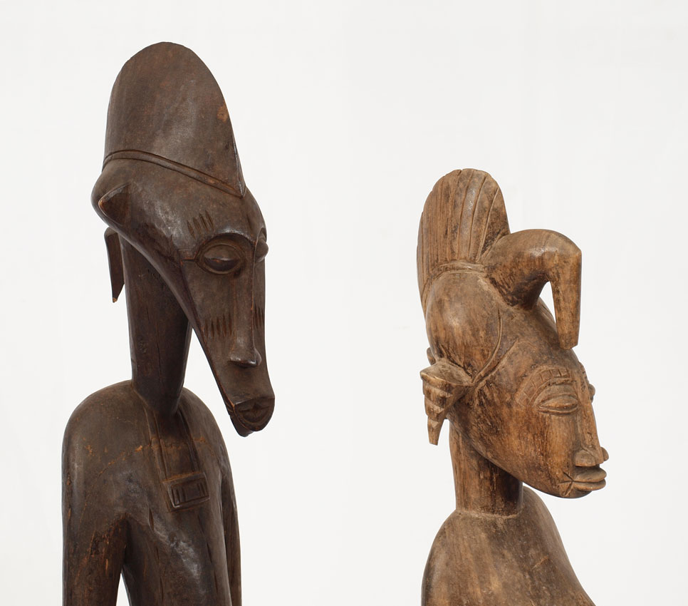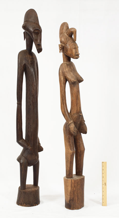 PAIR CARVED AFRICAN SENUFO POUNDERS: 52'' x 7'' x 7'', 15 lbs., & 48'' x 7'' x 6'', 18.5 lbs.