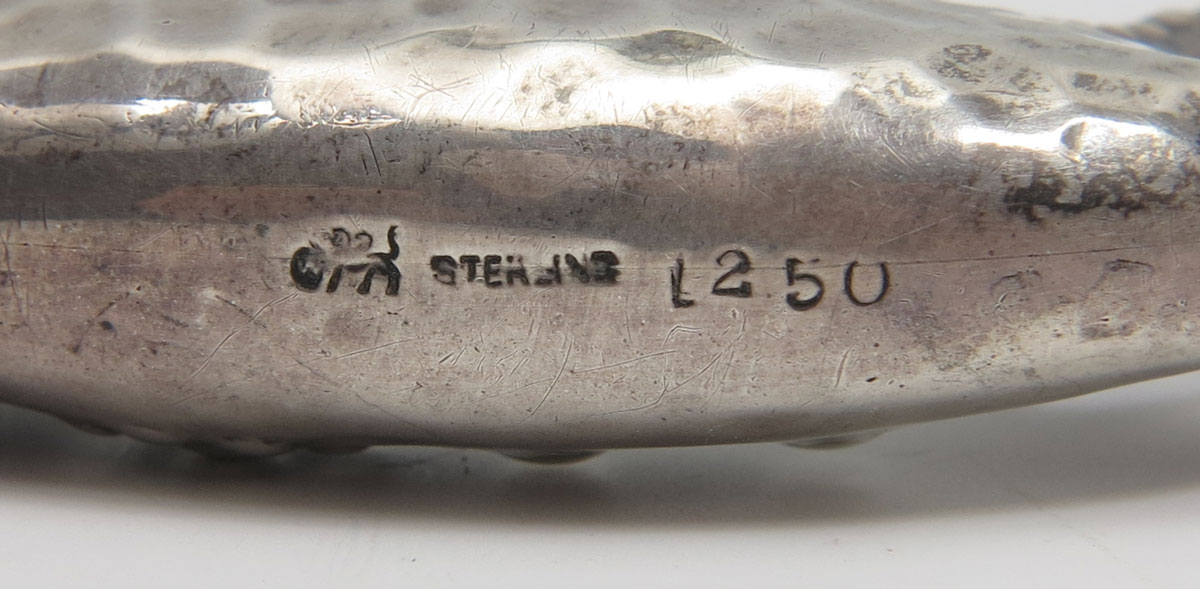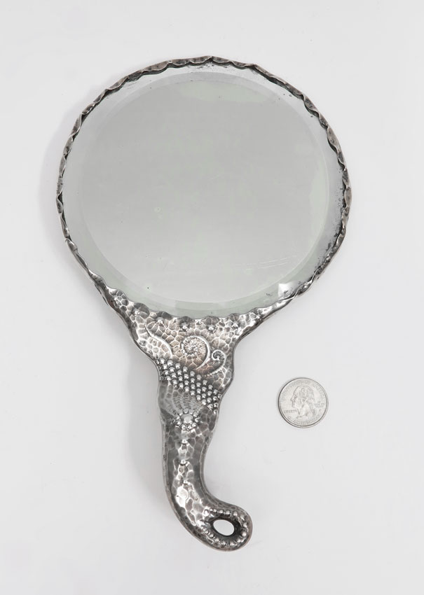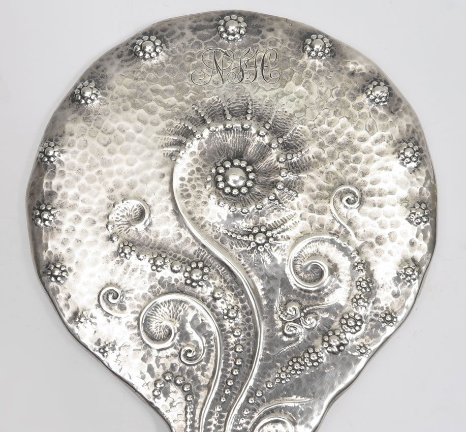 ART NOUVEAU STERLING SILVER MIRROR: Hand punched and hammered, nautical theme, Whiting, monogrammed, 9 1/2'' long.