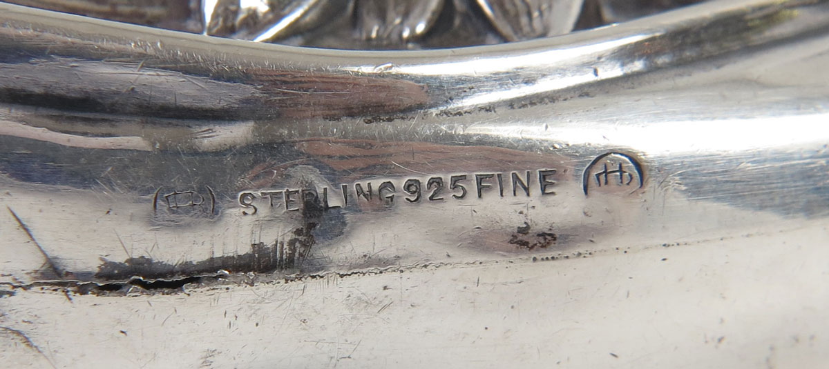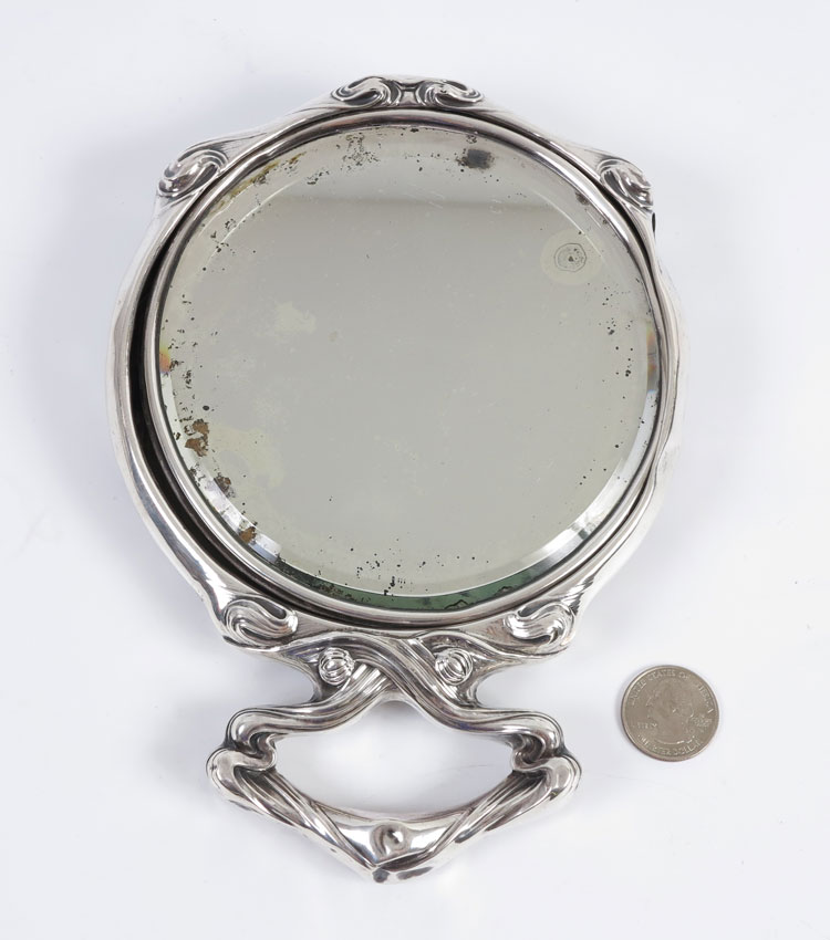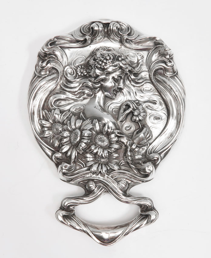 ART NOUVEAU STERLING SILVER MIRROR: Woman with Flower, Unger Bros., He Loves Me pattern. Measures 8 1/2''.