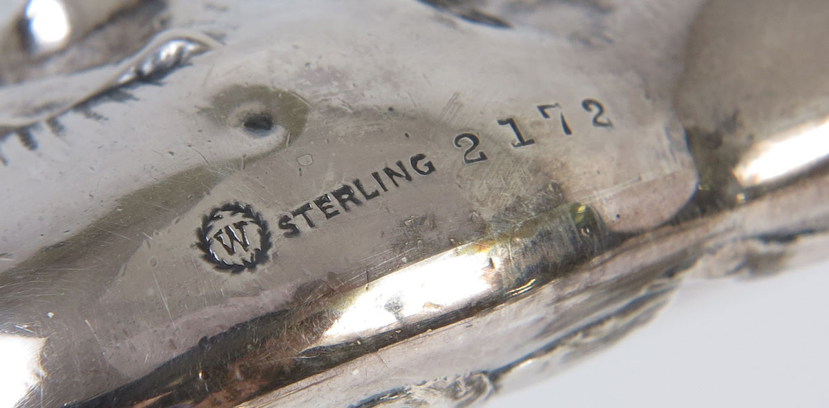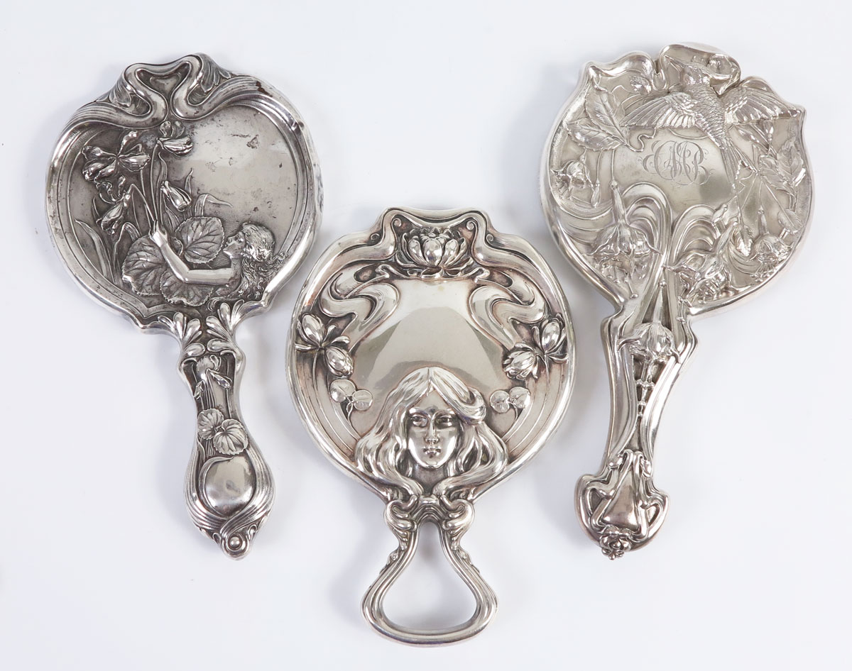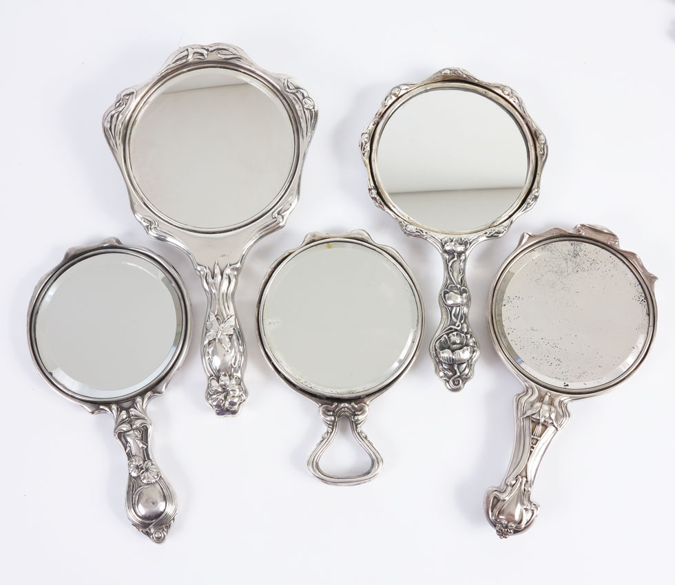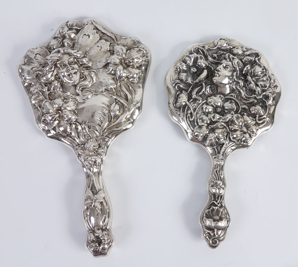 ART NOUVEAU SILVER MIRRORS: To include; 1) Girl's head at bottom, water lily, Simons Bros., rarer keyhole handle.; 2) Butterfly woman with smiling face, Woodside Sterling 11 1/2'' l. 3) Woman below right reaching to flowers with left arm, Simon Bros., 4) Hummingbird, Simon Bros. 5) Woman looking lrft in flowers. Several monogrammed.