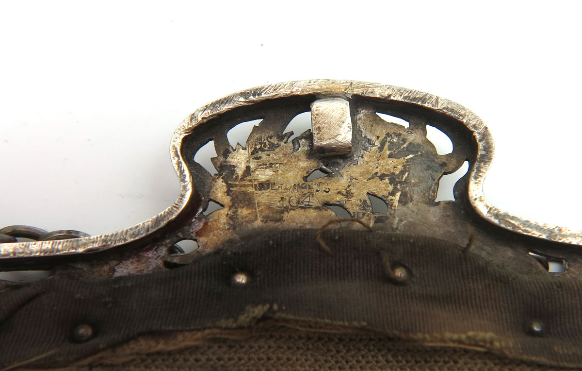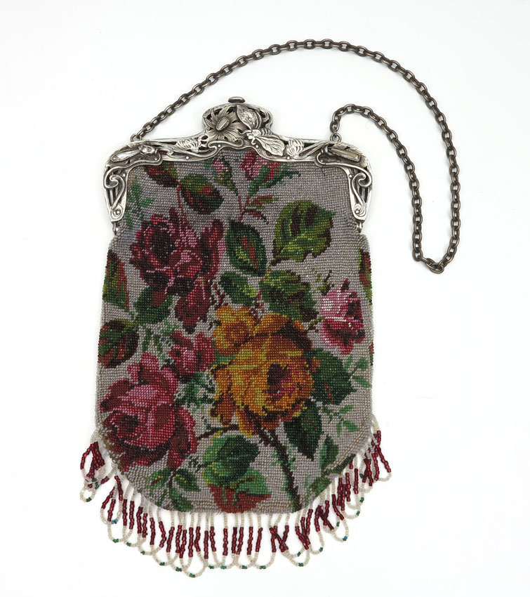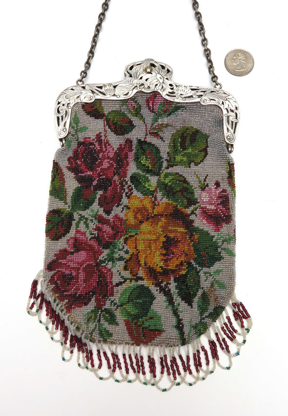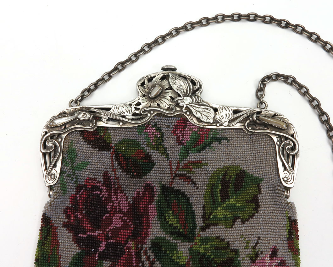 ART NOUVEAU STERLING SILVER PURSE: Sterling framed and jeweled insect decorated beaded evening bag, marked sterling with illegible maker's mark. From Lynell Schwartz, the author of the purse books; card and receipt on interior.