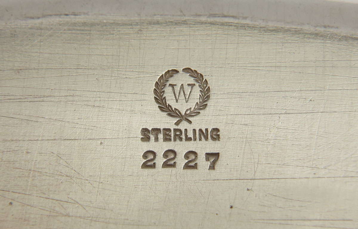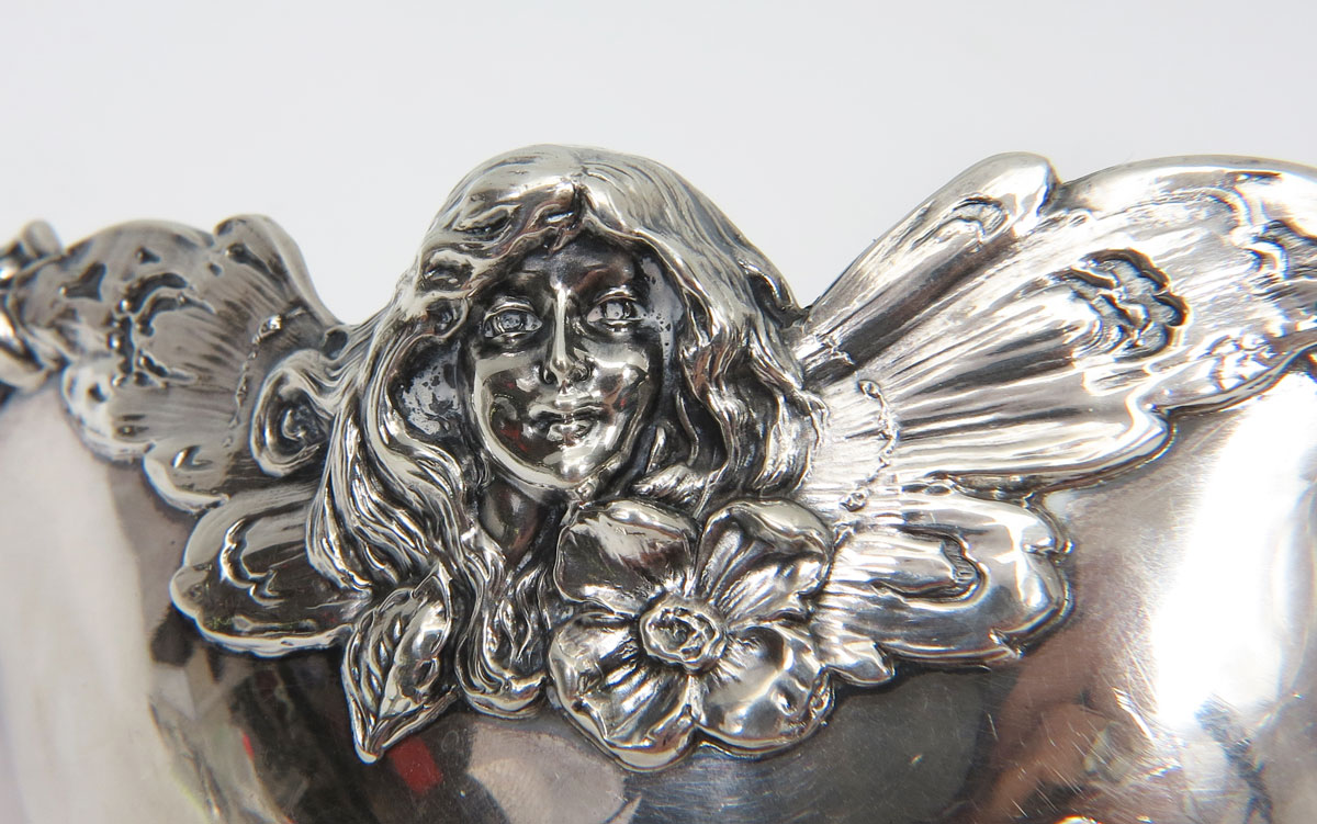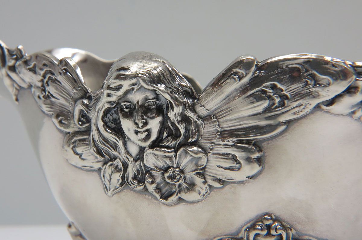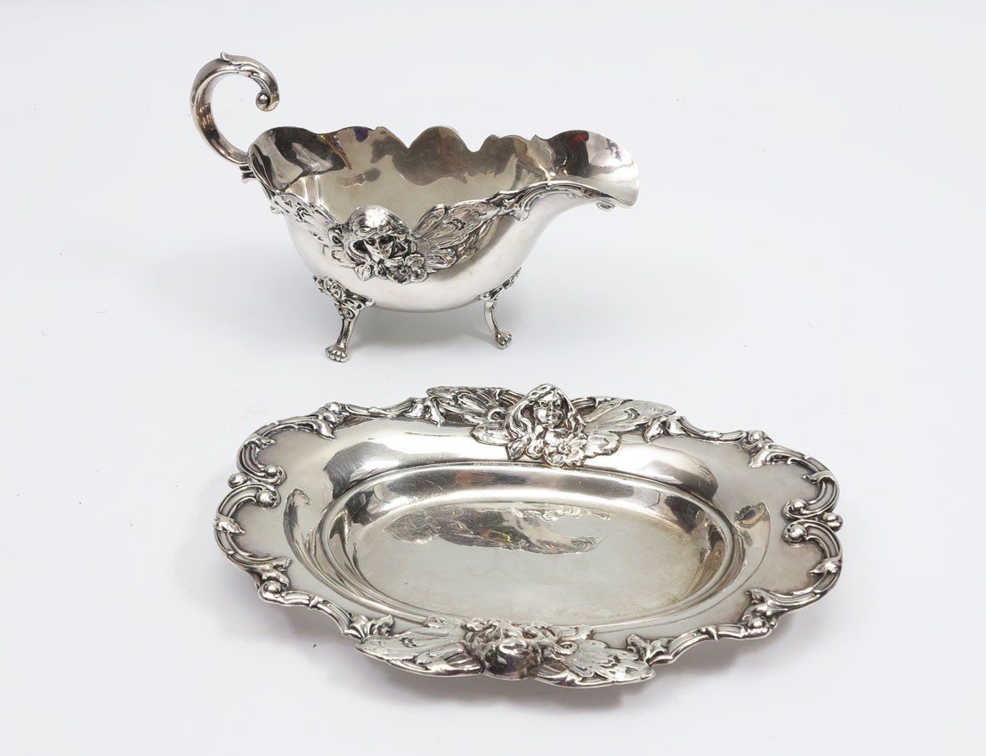 WOODSIDE STERLING COMPANY GRAVY BOWL & UNDERPLATE: Butterfly Woman, boat measures 4 1/2'' x 7 1/4'', plate measures 8 1/2'' x 6 1/4''. 11.8 Troy oz.