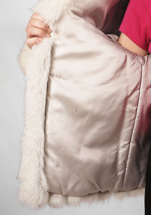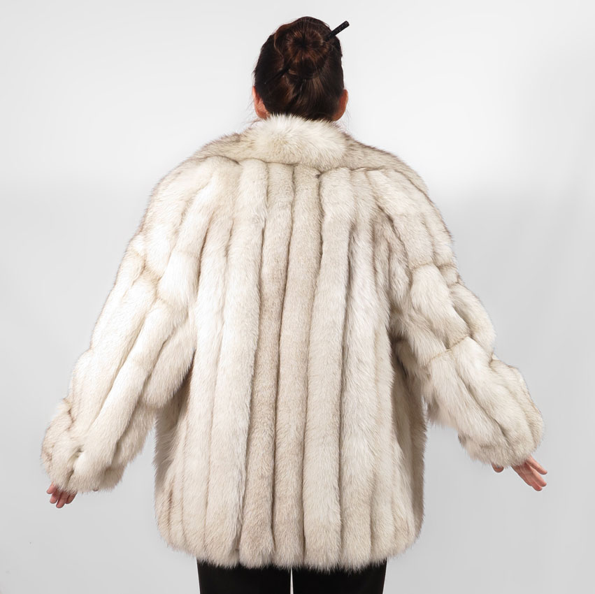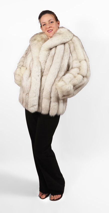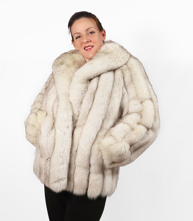 BLUE FOX FUR JACKET: Ribbed with white leather, silky lining, tag states this is natural blue fox from Finland. Medium to large size. 29'' l.